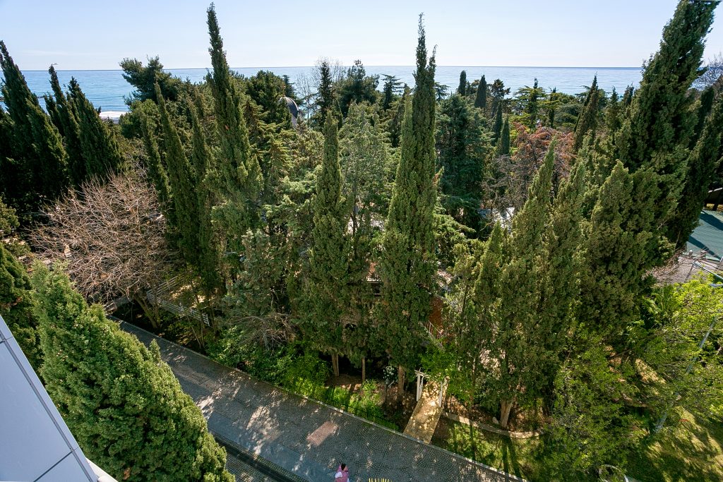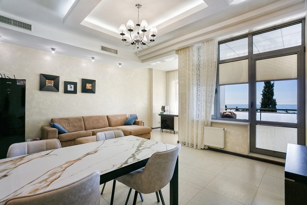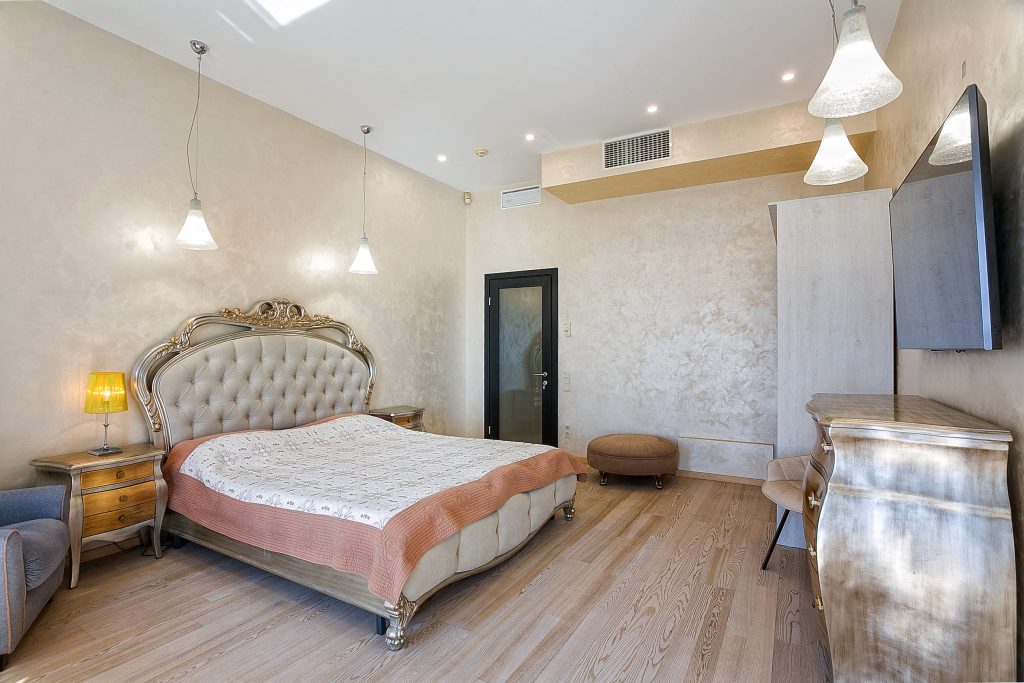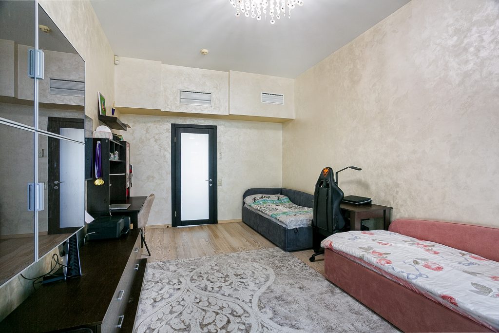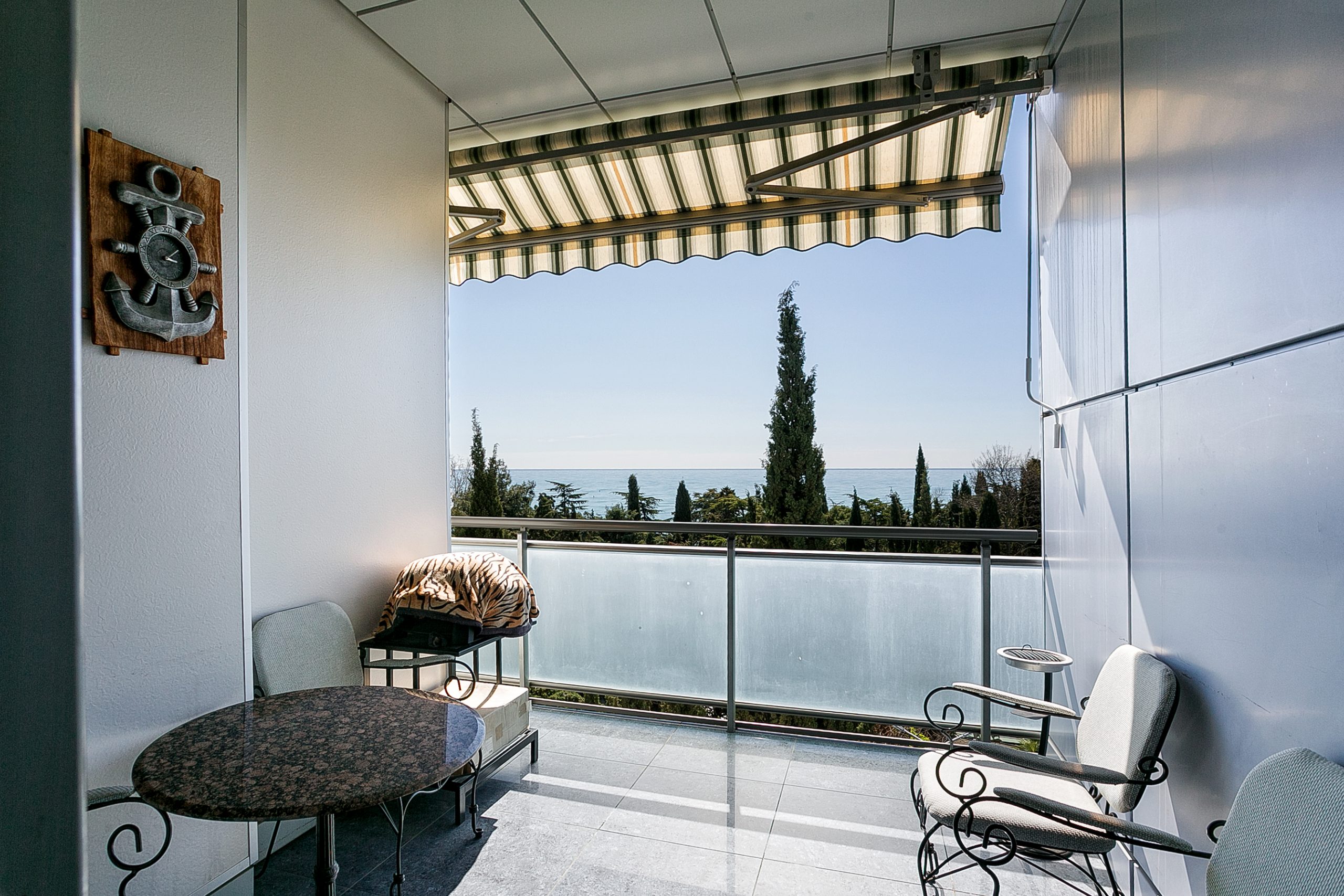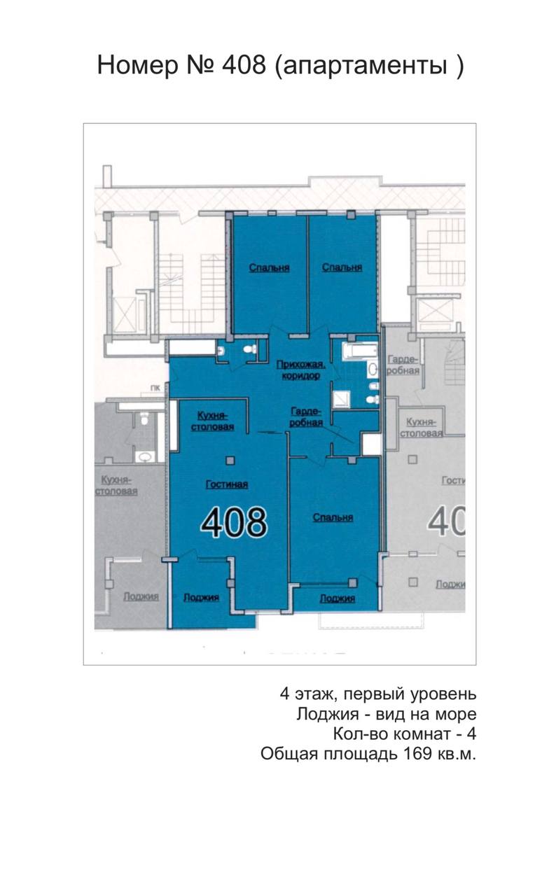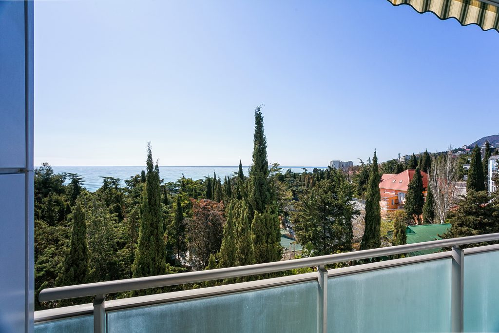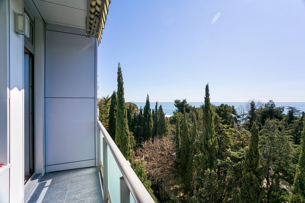 Общая площадь — 168,8 кв.м., апартаменты расположены на 4м этаже 9-этажного дома. Планировка апартаментов включает прихожую, кухню-гостиную, три спальни, два сан. узла, гардеробную, два балкона. Из окон кухни-гостиной, одной из спален и балконов — вид на парк и море. Высота потолков — 3,2 метра. Отопление — собственная котельная, централизованная система кондиционирования.