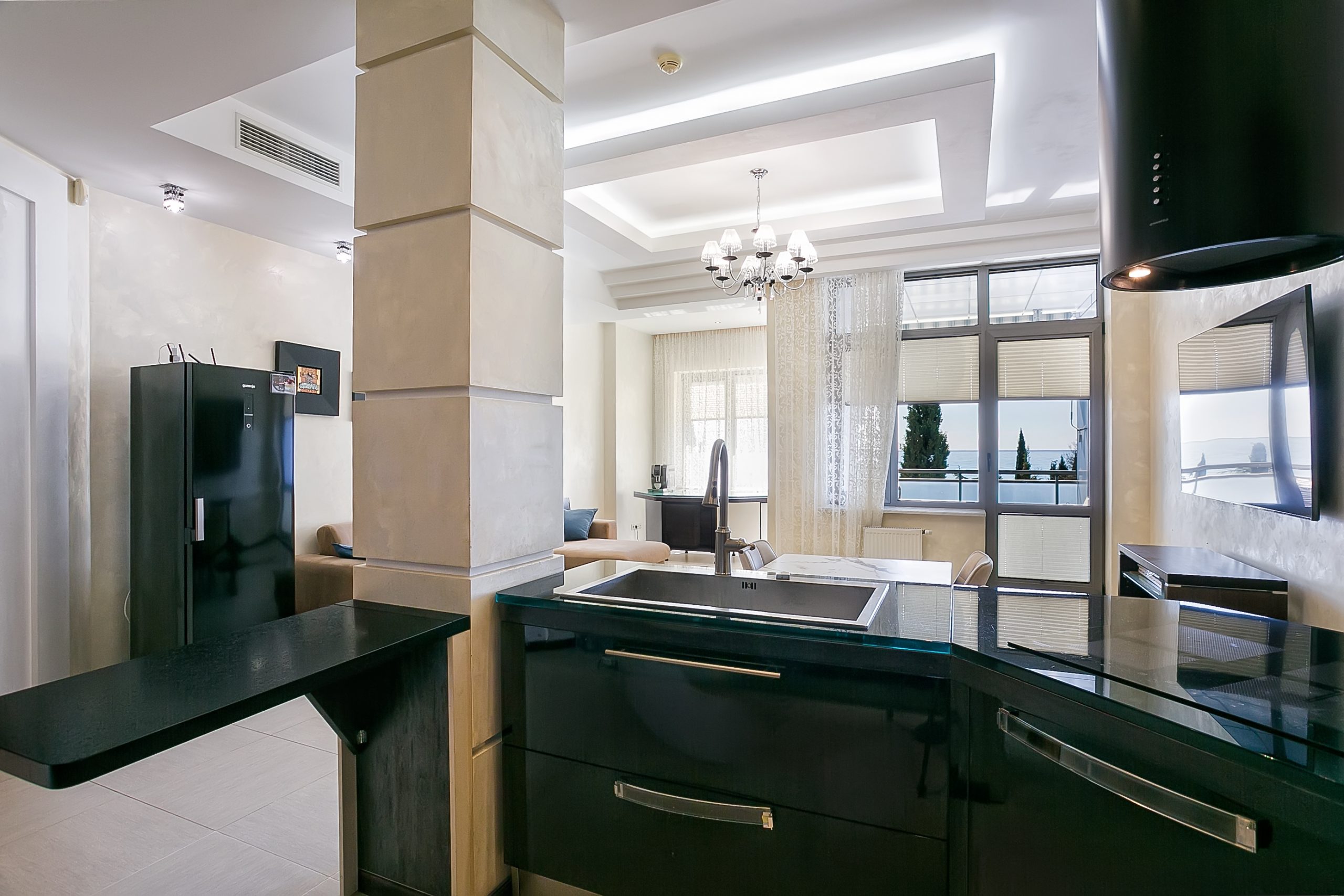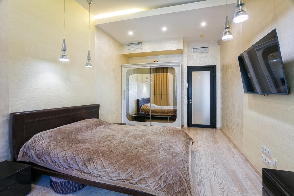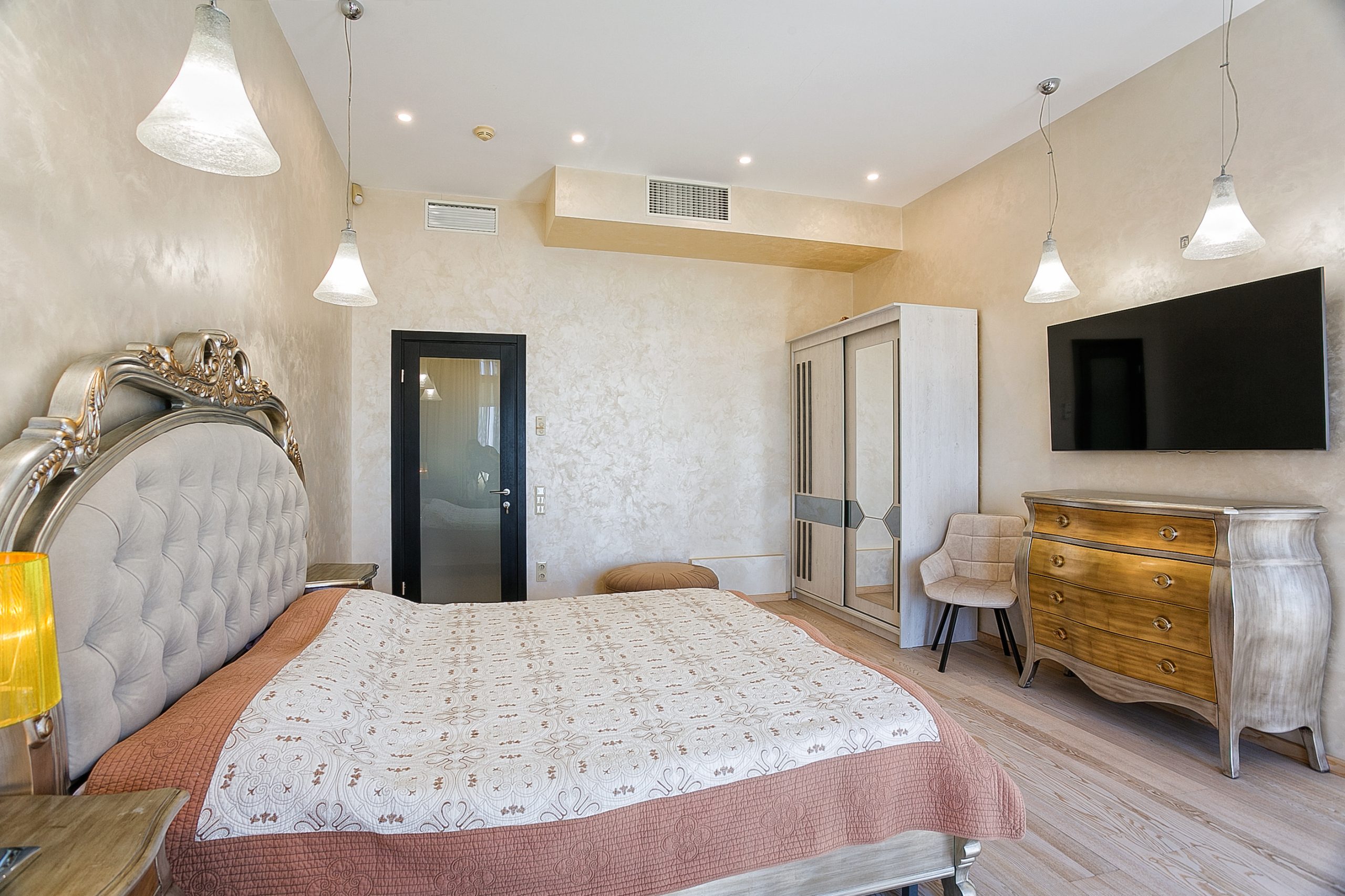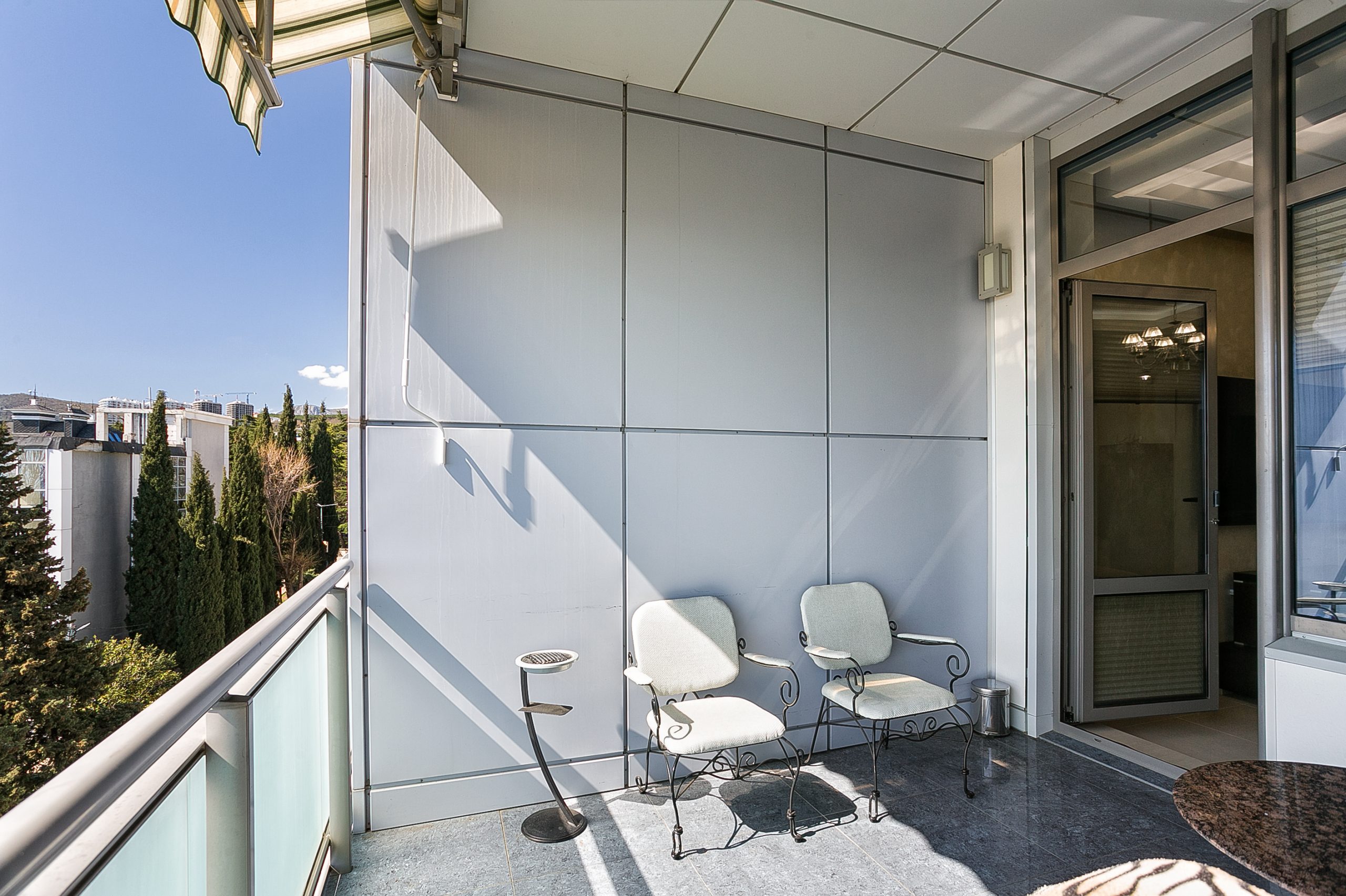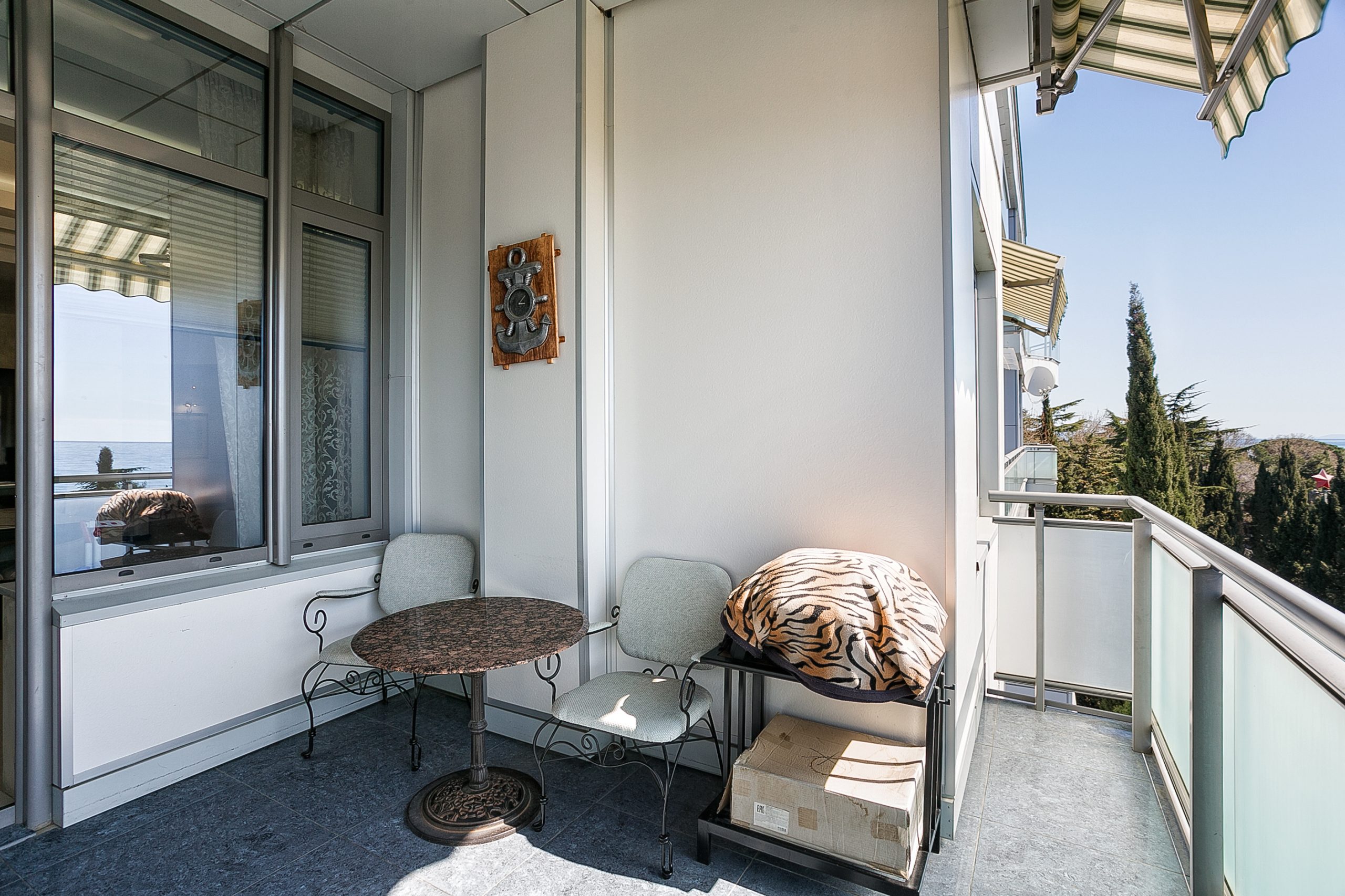 Общая площадь — 168,8 кв.м., апартаменты расположены на 4м этаже 9-этажного дома. Планировка апартаментов включает прихожую, кухню-гостиную, три спальни, два сан. узла, гардеробную, два балкона. Из окон кухни-гостиной, одной из спален и балконов — вид на парк и море. Высота потолков — 3,2 метра. Отопление — собственная котельная, централизованная система кондиционирования.