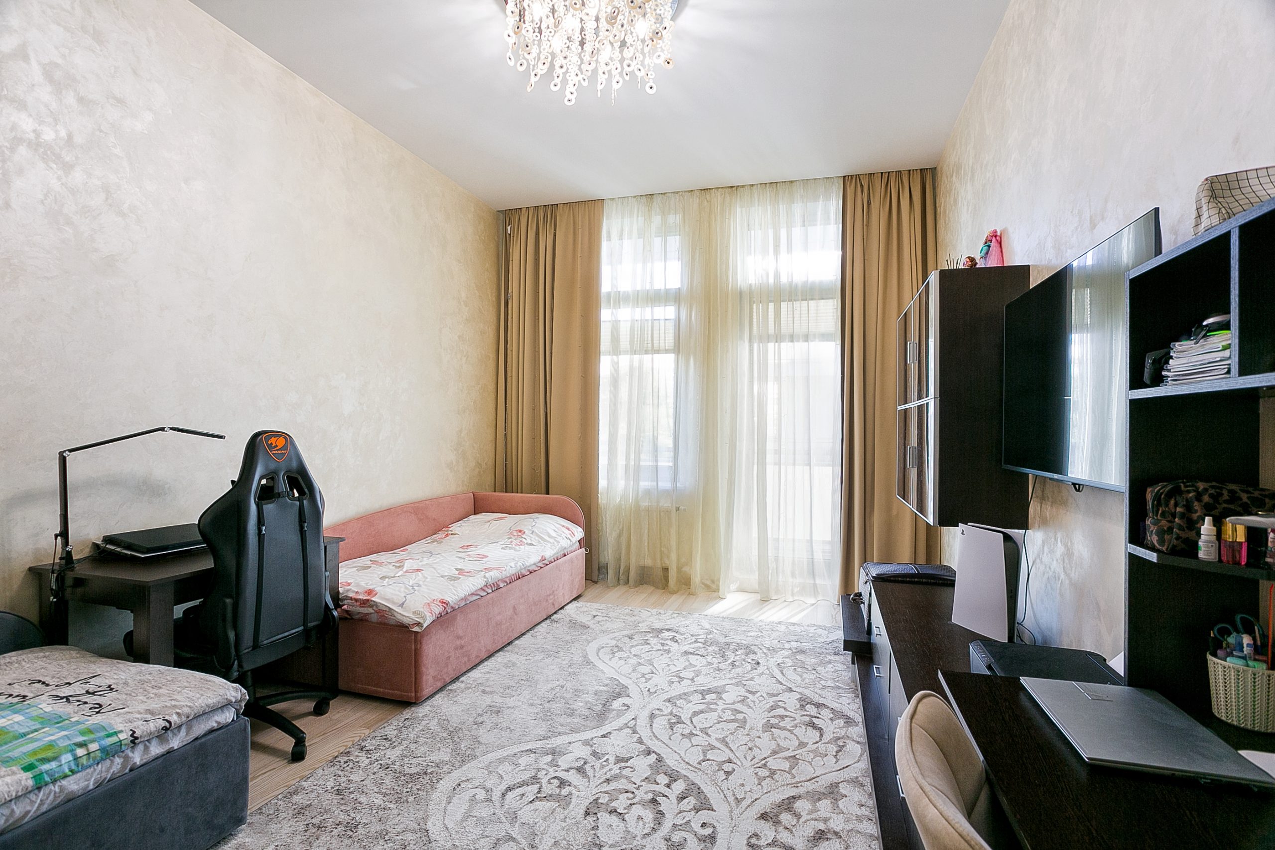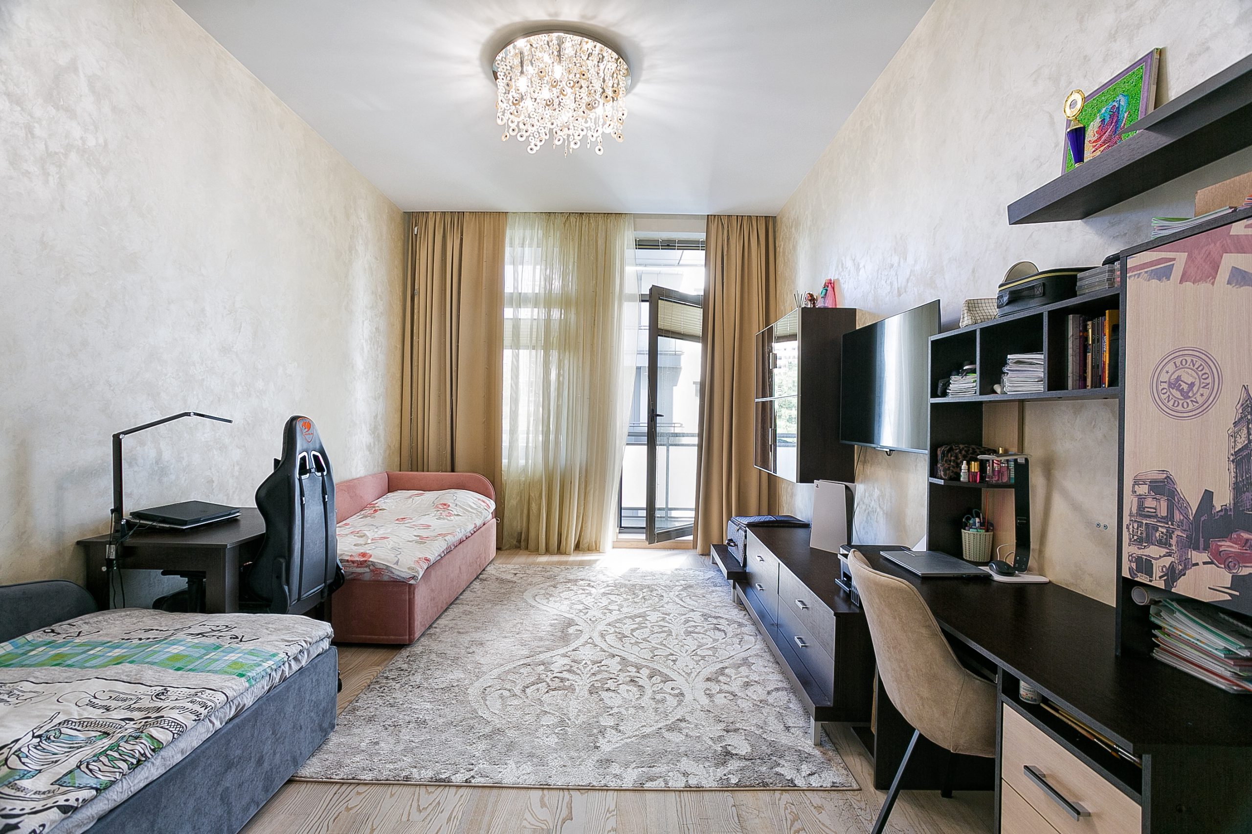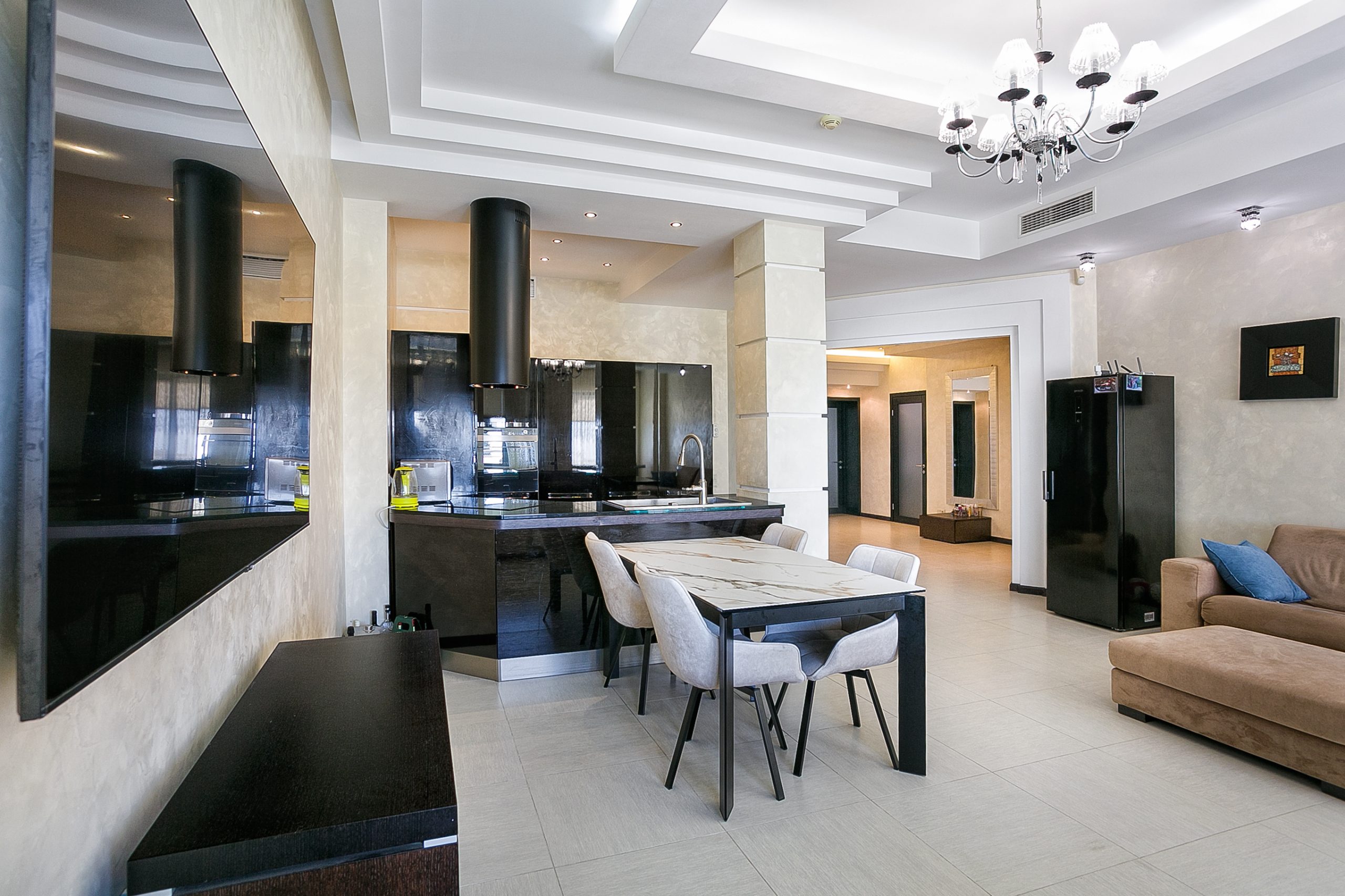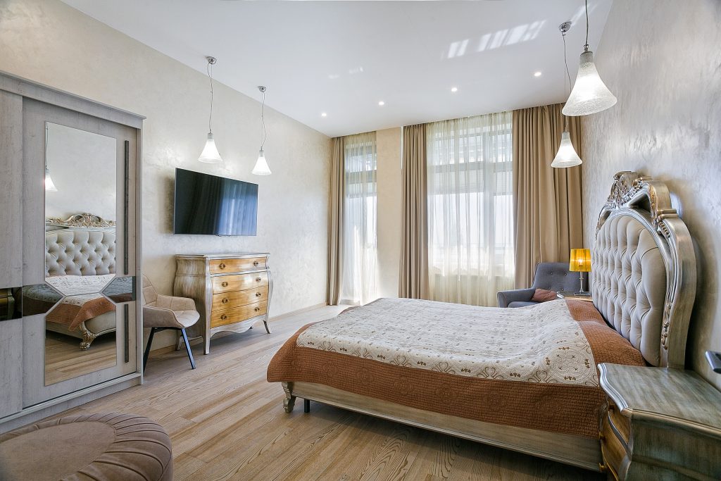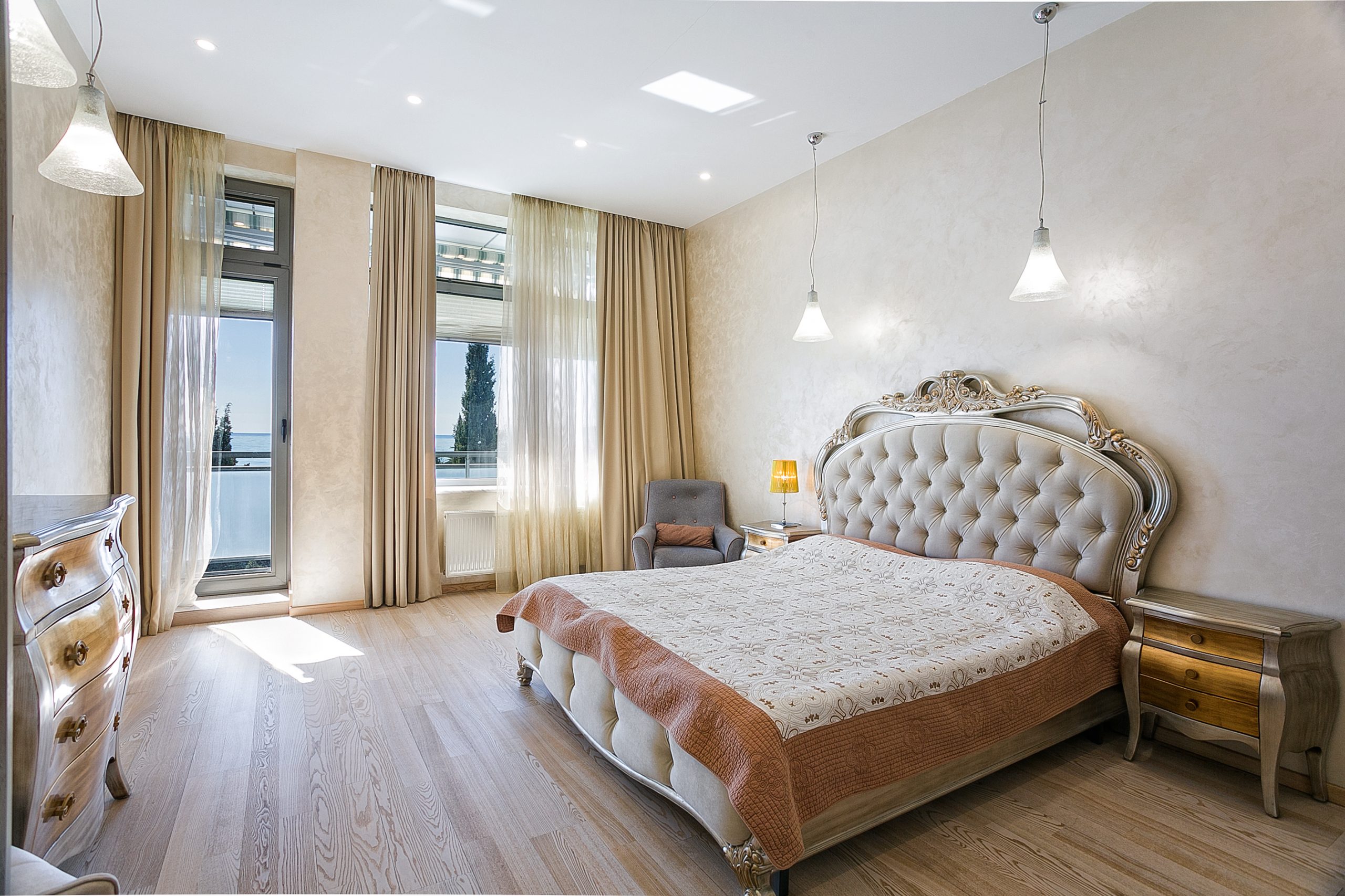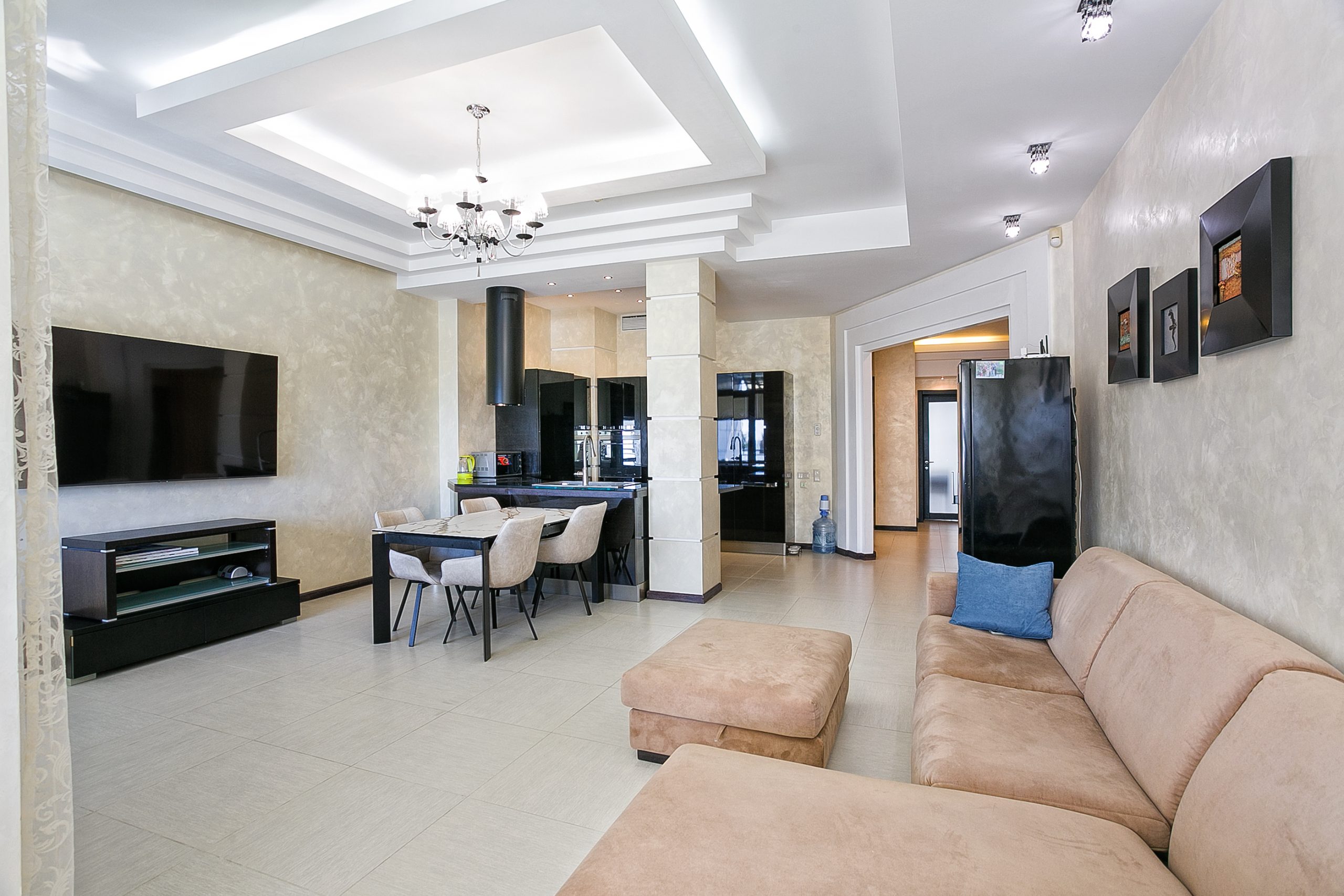 Общая площадь — 168,8 кв.м., апартаменты расположены на 4м этаже 9-этажного дома. Планировка апартаментов включает прихожую, кухню-гостиную, три спальни, два сан. узла, гардеробную, два балкона. Из окон кухни-гостиной, одной из спален и балконов — вид на парк и море. Высота потолков — 3,2 метра. Отопление — собственная котельная, централизованная система кондиционирования.