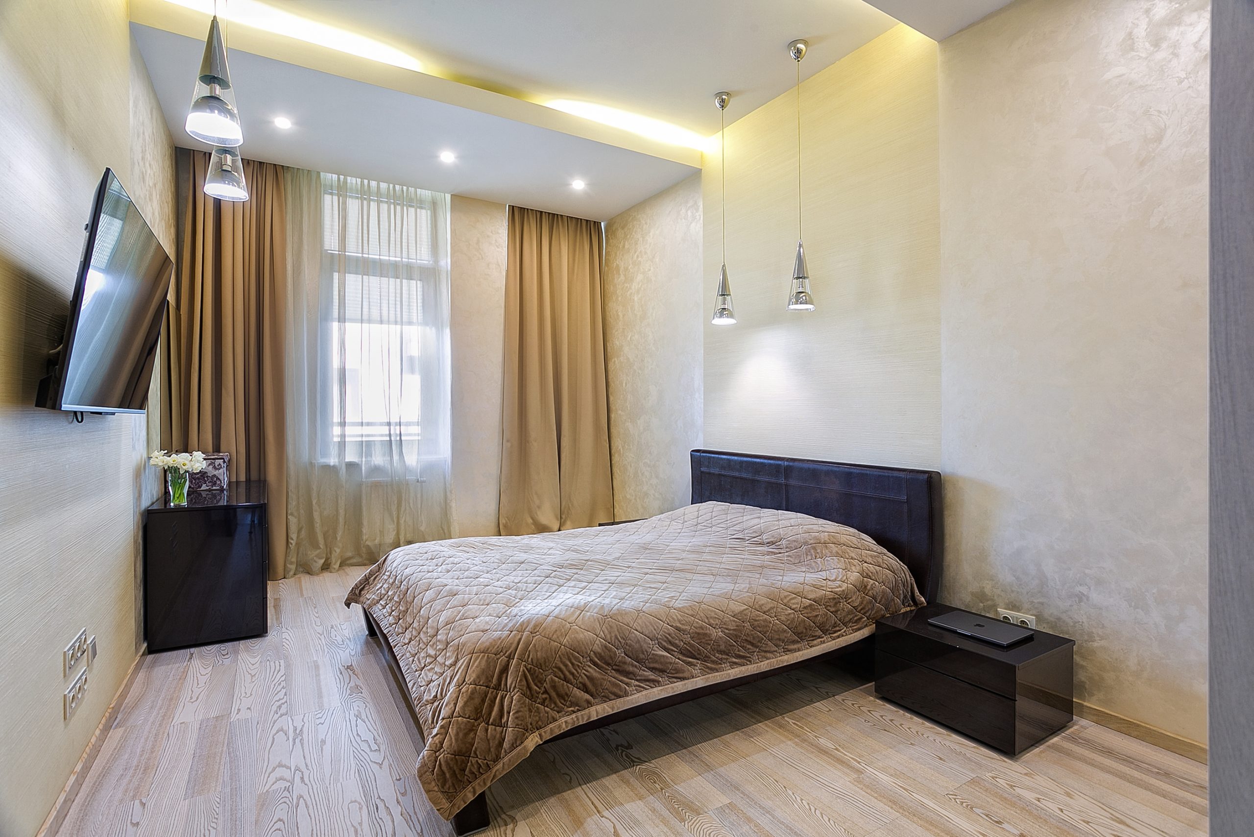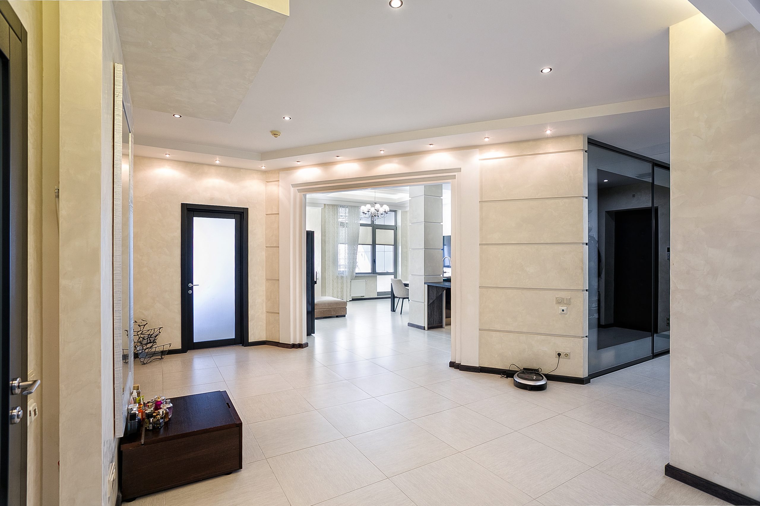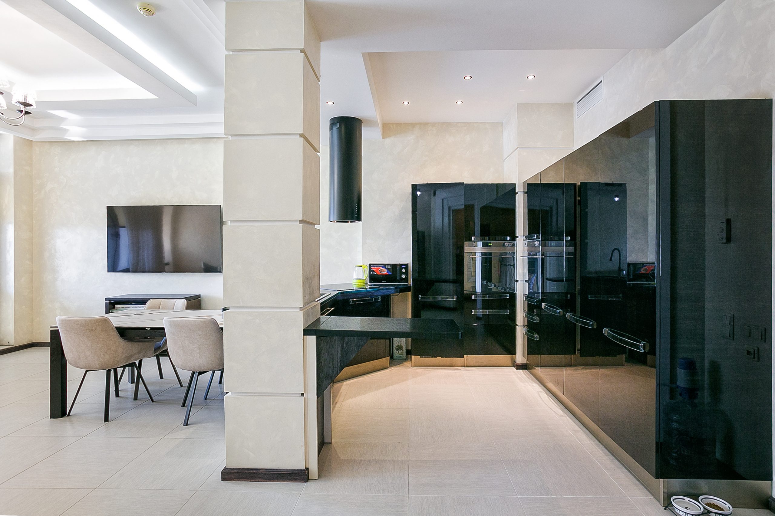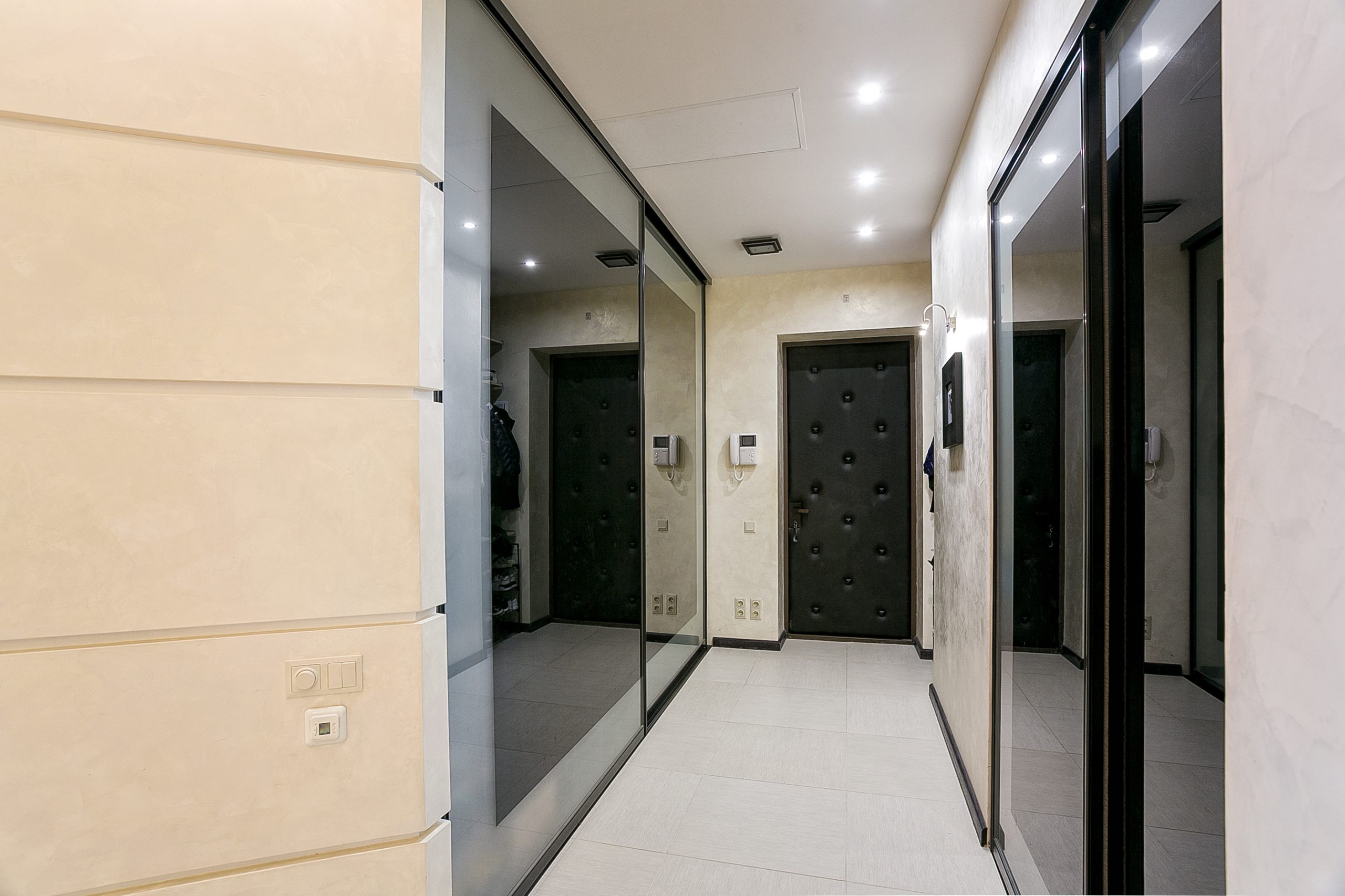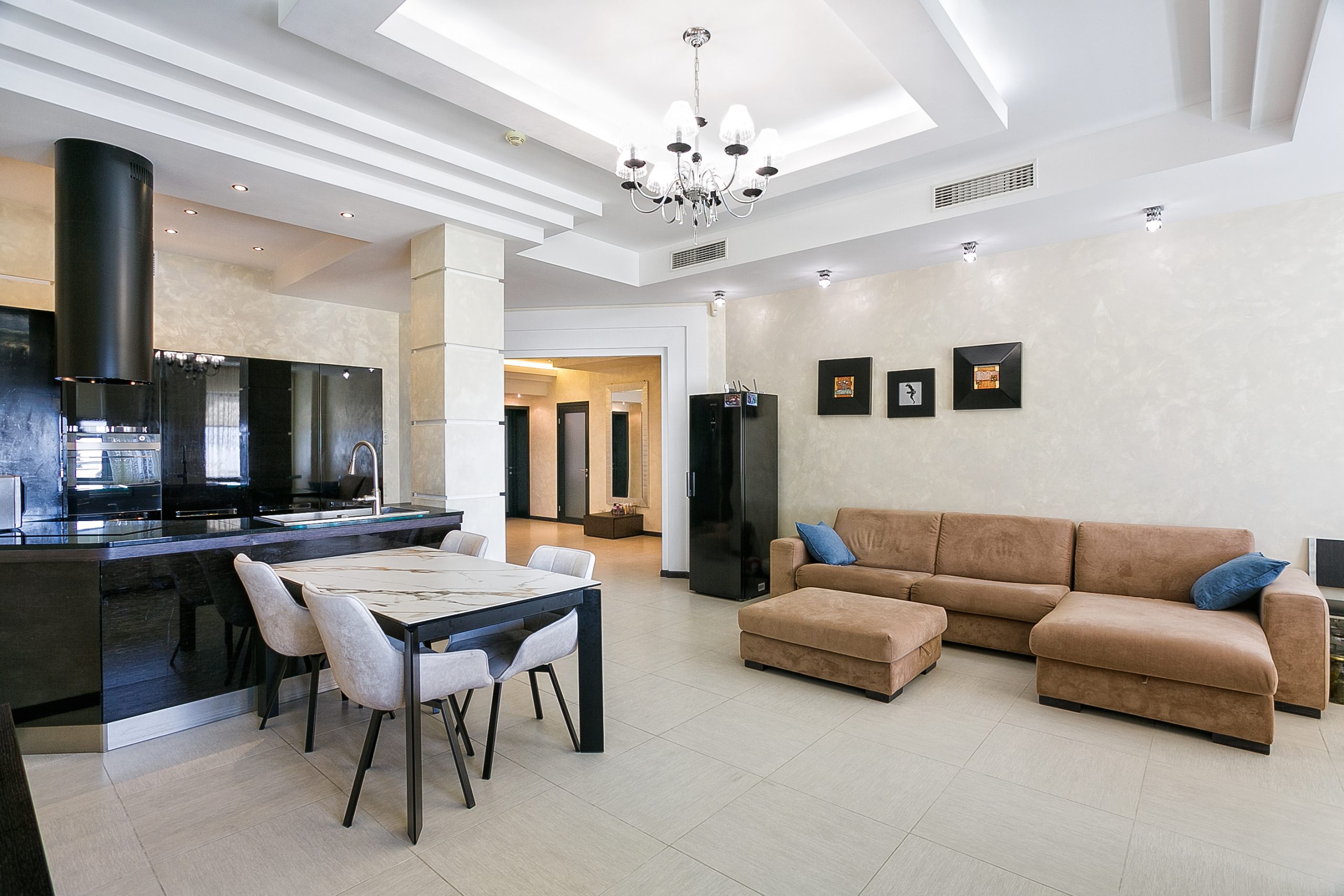 Общая площадь — 168,8 кв.м., апартаменты расположены на 4м этаже 9-этажного дома. Планировка апартаментов включает прихожую, кухню-гостиную, три спальни, два сан. узла, гардеробную, два балкона. Из окон кухни-гостиной, одной из спален и балконов — вид на парк и море. Высота потолков — 3,2 метра. Отопление — собственная котельная, централизованная система кондиционирования.