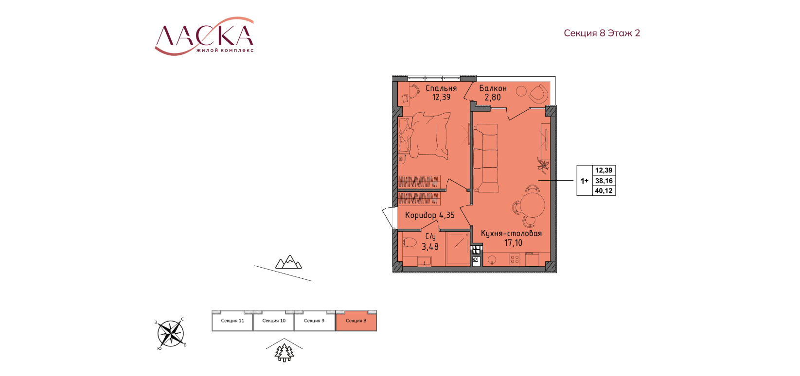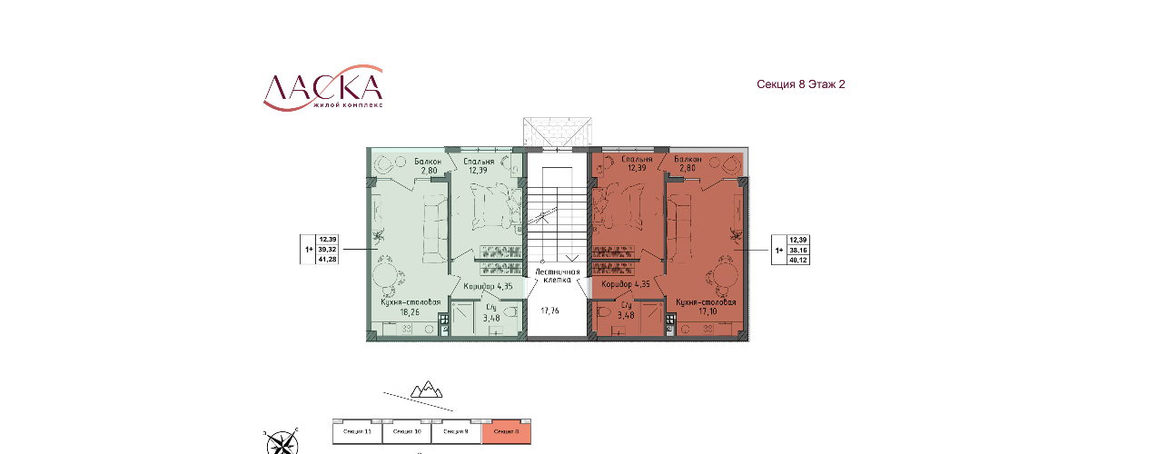 Квартира на 2 этаже 4-этажного дома в 8-й секции площадью 38,16 кв.м. На лестничной площадке находятся только две квартиры, что позволяет создать ощущение приватности. Квартира сдается в предчистовой отделке (White Box), усиленная шумоизоляция окон, входных дверей и стен. Высота потолков 3 м.