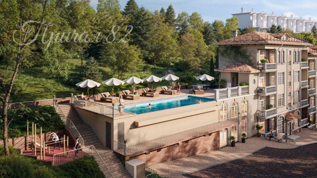Так же резидентам будет доступна вся инфраструктура апарт-комплекса «Ласка»: SPA-комплекс, кинотеатр на свежем воздухе, летнее кафе, подогреваемый каскадный бассейн, зона отдыха с шезлонгами, качели над водой, массажный кабинет, беседки и гамаки в окружении фруктовых деревьев.