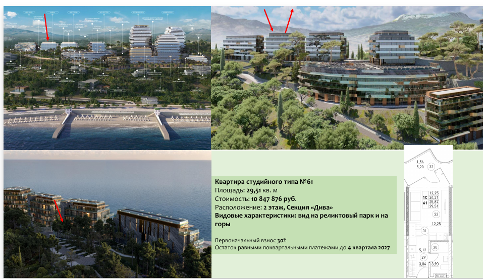 Квартира студийного типа общей площадью 29,51 кв.м. на 2 этаже 6 этажного здания, секция «Дива». Вид с окон открывается на реликтовый парк и на горы. Высота потолков 3 м. Внутренняя отделка не осуществляется.