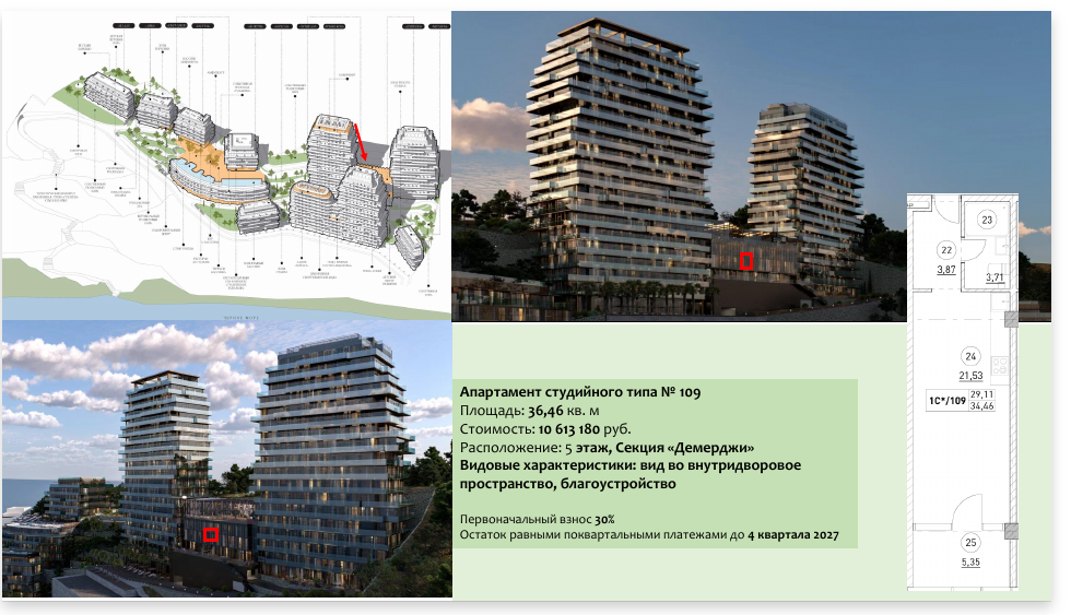 Апартаменты студийного типа общей площадью 36,46 кв.м. на 5 этаже секции «Демерджи». Вид с окон открывается во внутридворовое пространство. Высота потолков 3 м. Внутренняя отделка не осуществляется.