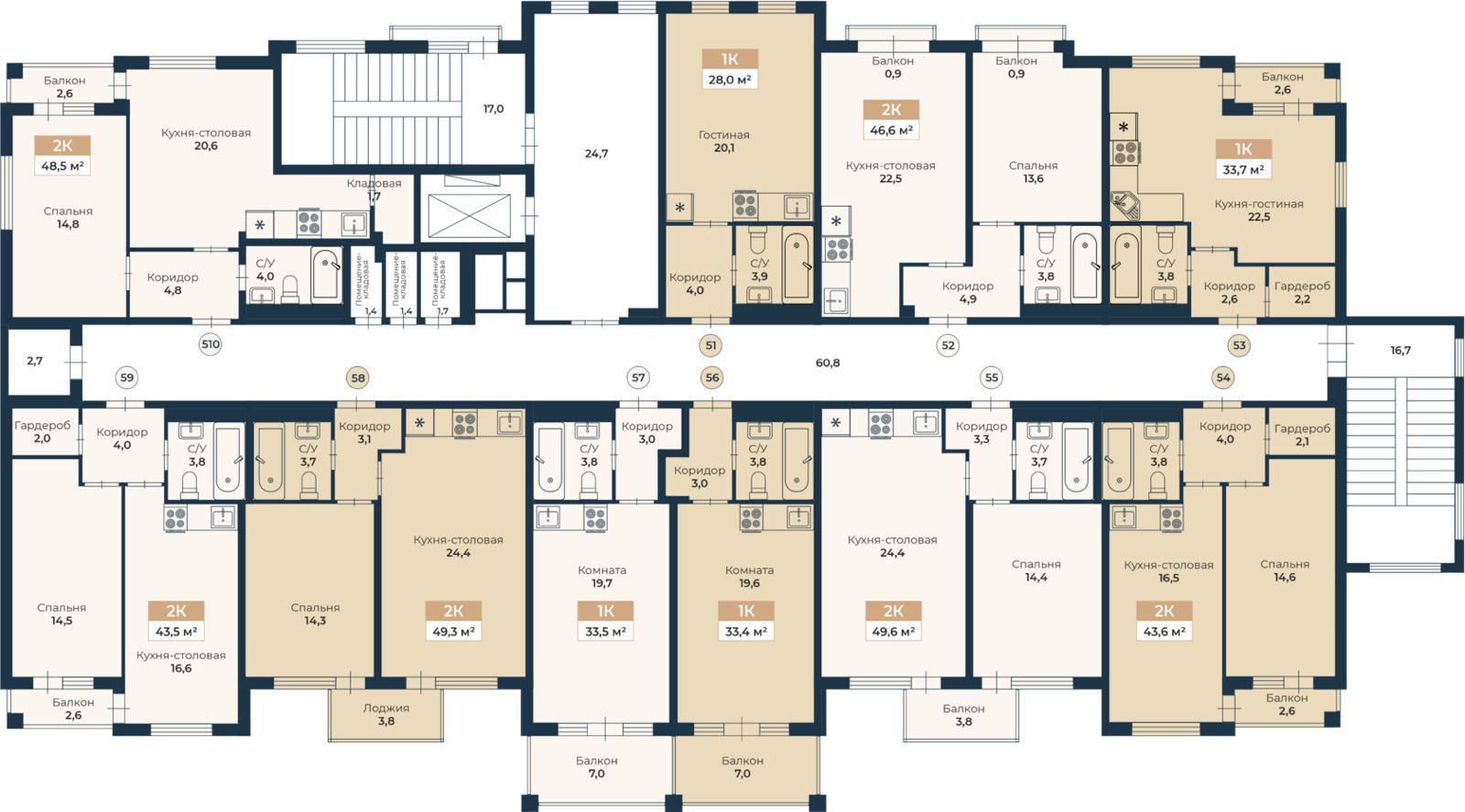 Вы можете приобрести лоты площадью от 28 до 59,8 кв.м. с возможностью объединения апартаментов. Состояние – под отделку, залита стяжка, оштукатурены стены, выполнена разводка коммуникаций.