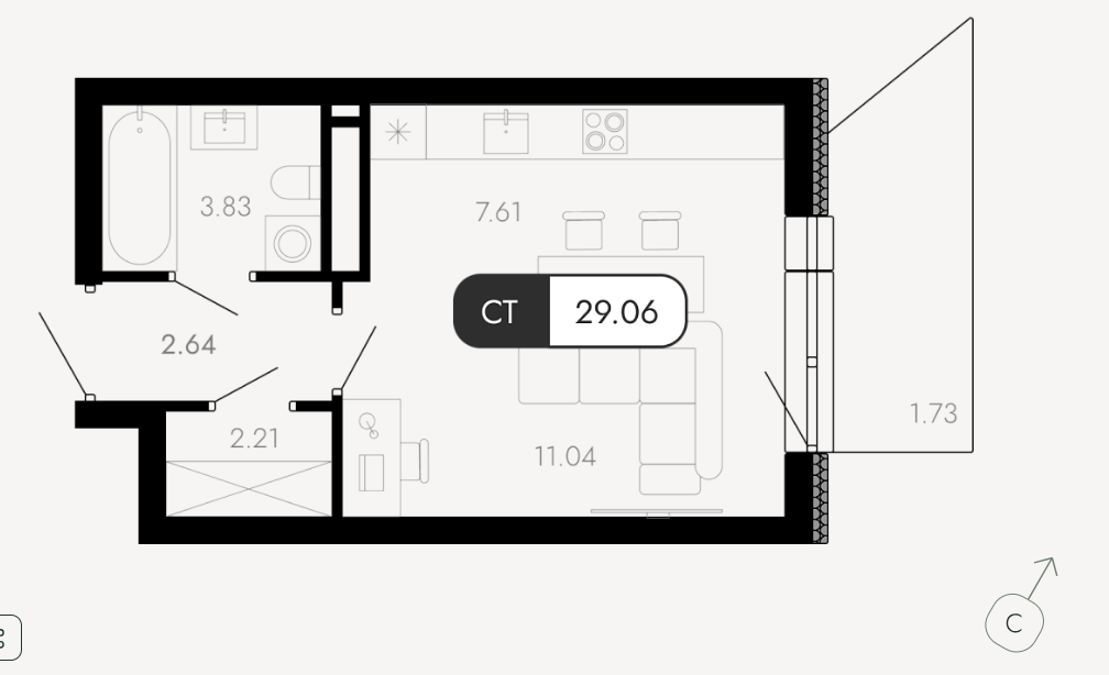 Студия в квартале «Можжевеловый» 4 секция на 3 этаже 7 этажного здания. Общая площадь – 29,06 кв.м., кухня-гостиная 18,65 кв.м., сан.узел 3,83 кв.м., балкон 5,76 (входит с коэф. в общую площадь). Высота потолков 2.85 м. Сдается без отделке. С балкона открывается вид променад.