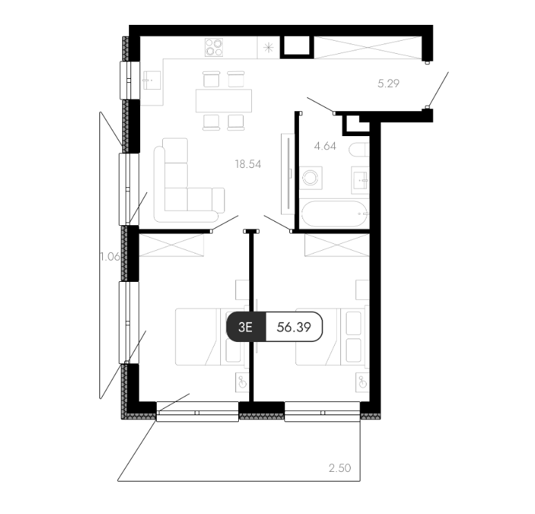 Евро 3-комнатная квартира в квартале «Можжевеловый» 4 секция на 3 этаже 7 этажного здания. Общая площадь – 56,39 кв.м., кухня-гостиная 18,54 кв.м., две спальни , сан.узел 4,64 кв.м., два балкона. Высота потолков 2.85 м. Сдается без отделки. С балконов открывается вид на парк.