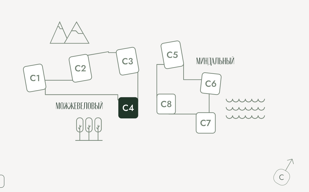 Территория комплекса 5,5 га, а территория дендропарка – 16 Га. 1-я очередь строительства кварталы «Можжевеловый» и «Миндальный» 8 корпусов, высотой от 7 до 14 этажей. Площадь квартир представлена от 27 кв.м. до 111 кв.м. Панорамное остекление, открытые террасы, пентхаусы и двухуровневые квартиры.