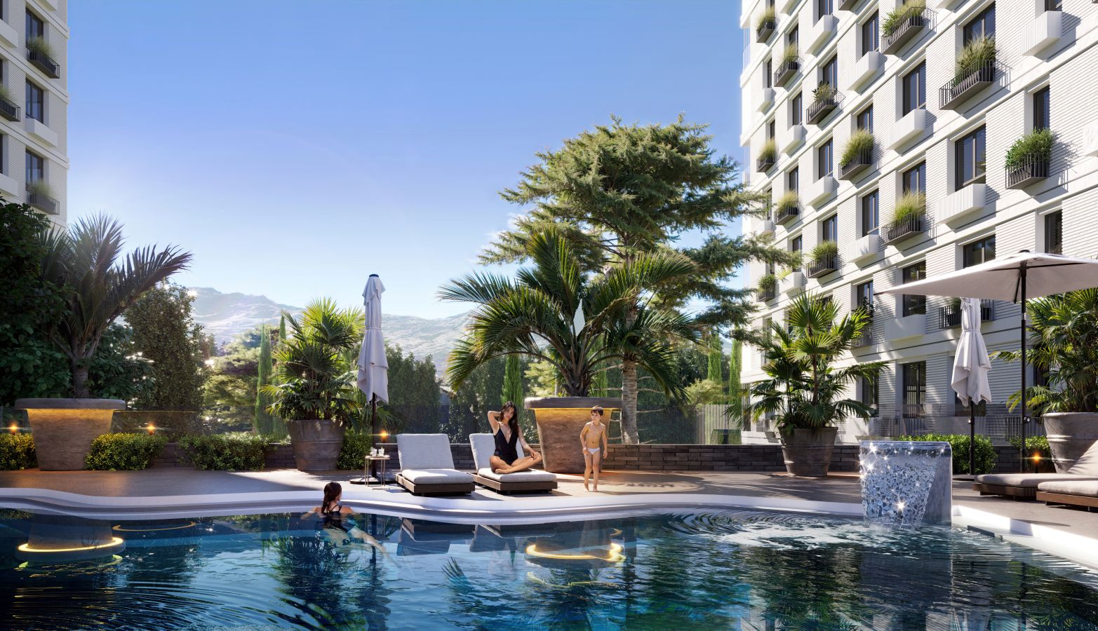 — бассейны закрытые и открытые, для детей предусмотрены безопасные аквагорки. Рядом с аквазонами — бары и зоны шезлонгов;