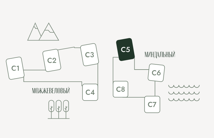 Территория комплекса 5,5 га, а территория дендропарка – 16 Га. 1-я очередь строительства кварталы «Можжевеловый» и «Миндальный» 8 корпусов, высотой от 7 до 14 этажей. Площадь квартир представлена от 27 кв.м. до 111 кв.м. Панорамное остекление, открытые террасы, пентхаусы и двухуровневые квартиры.