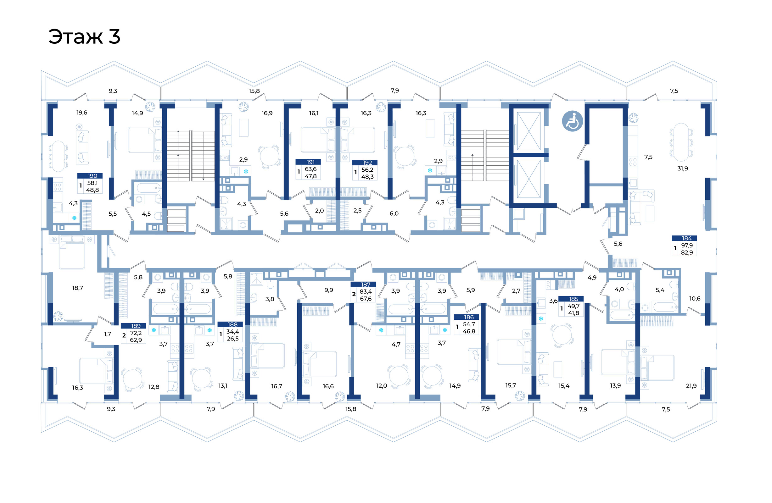 Две смелые и многогранные башни 21 этажности на 348 апартаментов, на первом этаже коммерческие помещения. Трехуровневый подземный паркинг на 115 мест. В каждой башне – своя входная группа, дизайнерское лобби, предусмотрено 2 лифта грузоподъемностью 1000 кг., колясочная. Закрытая охраняемая территория, видеонаблюдение 24/7. Уникальный сервис управляющей компании – это максимальный комфорт, и легкость от повседневных забот. Доверительное управление с высоким уровнем сервиса поможет получать стабильный пассивный доход без Ваших усилий.