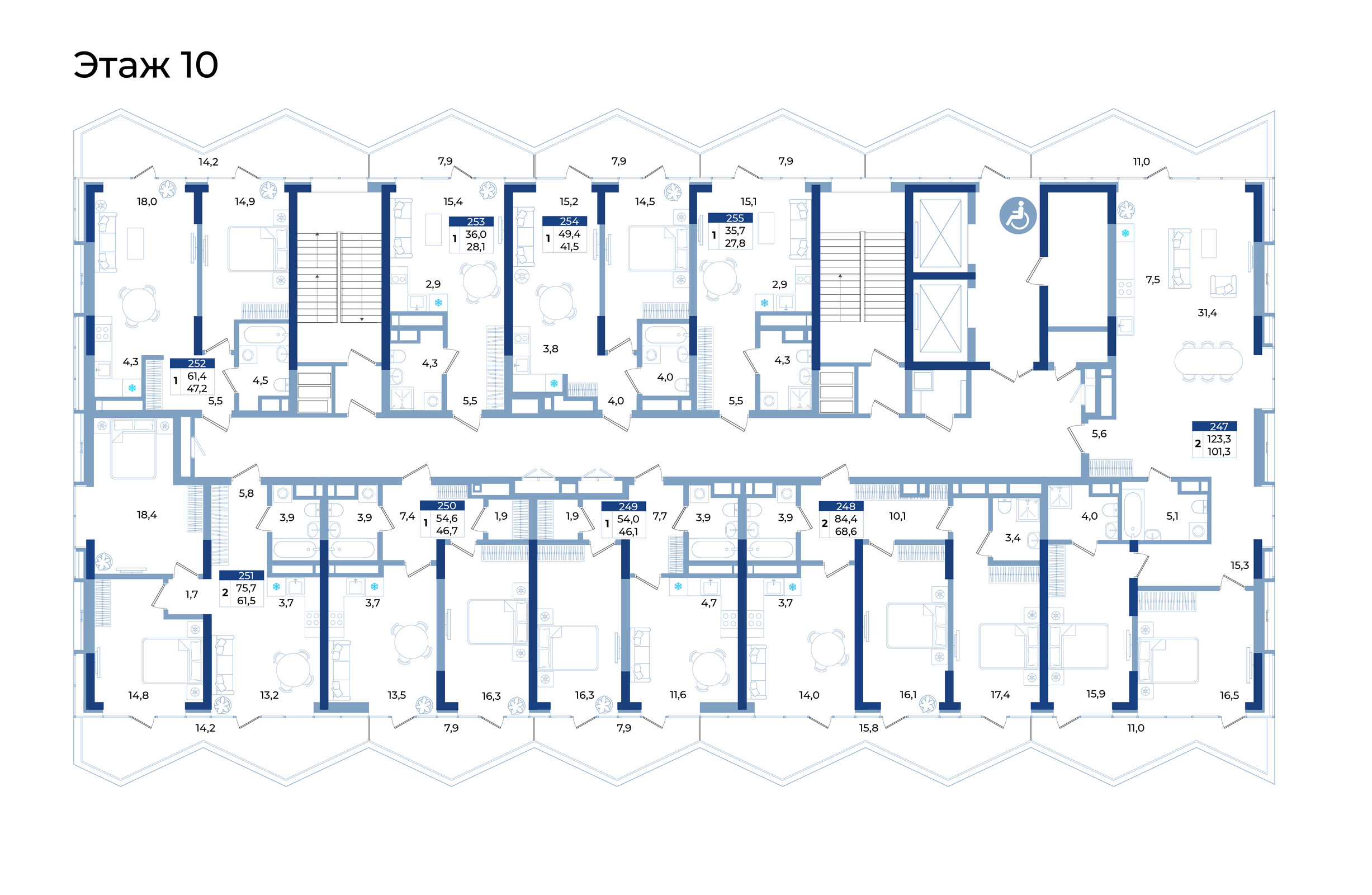 • эксклюзивный формат пентхаусов на верхних этажах (всего 6 лотов) от 121,6 кв.м. до 237,6 кв.м.