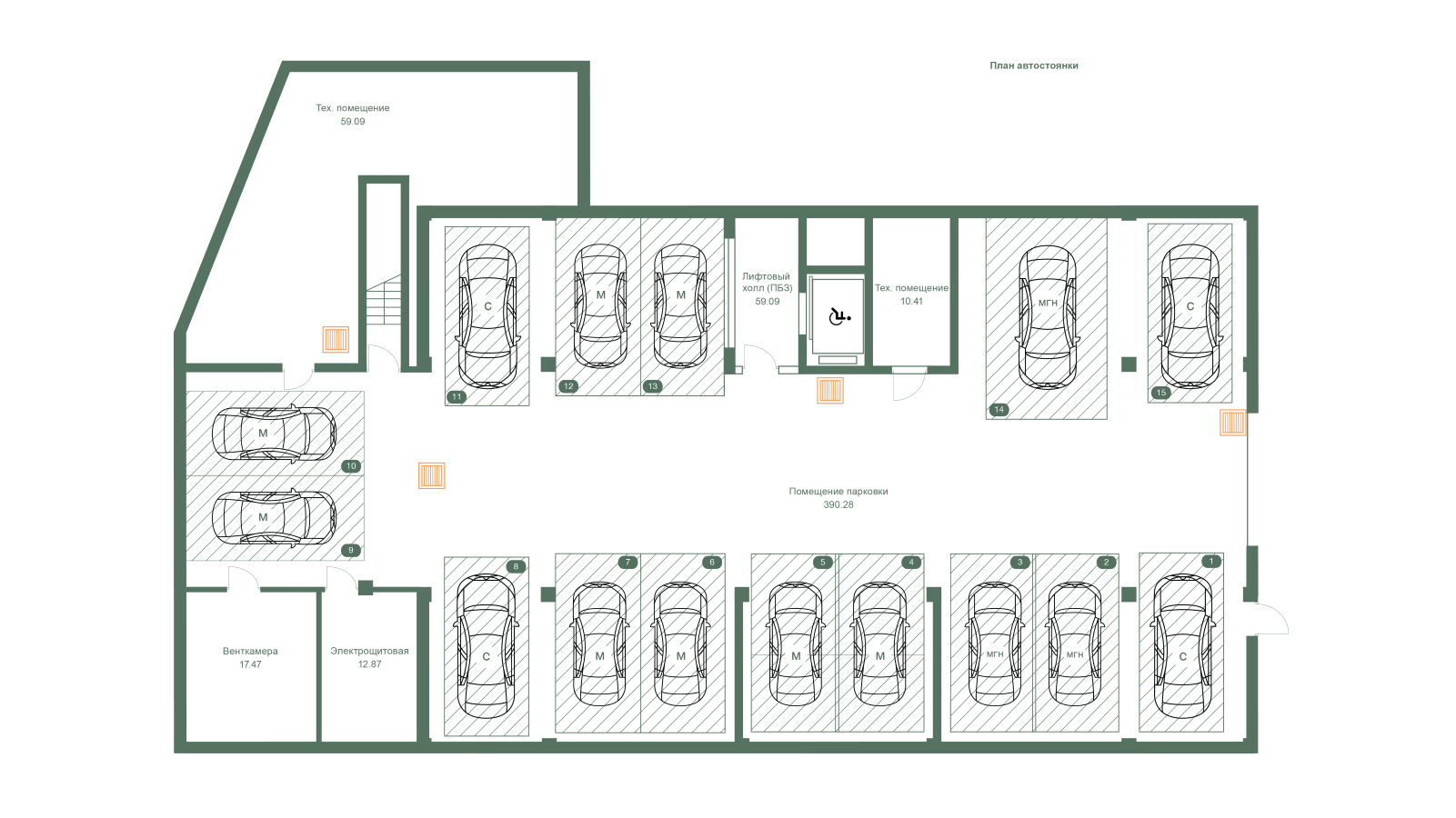 — Подземная парковка на 45 машиномест + парковочные стилобаты на территории