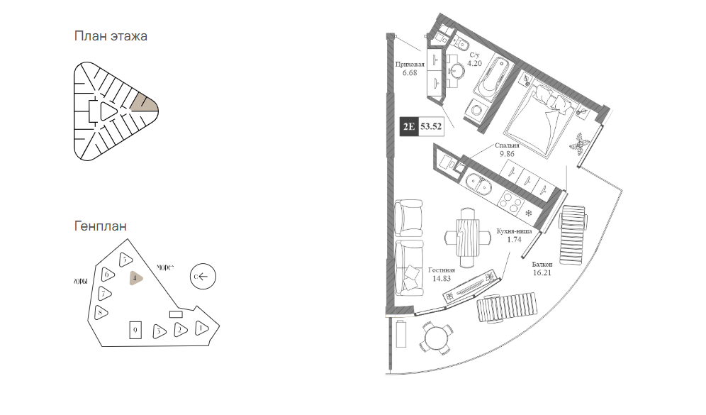 Евро 2-комнатные апартаменты общей площадью 53,52 кв.м., на 4м этаже 20-этажного здания, с прямым видом на море, в корпусе «Куприн» (введен в эксплуатацию в декабре 2025г.)