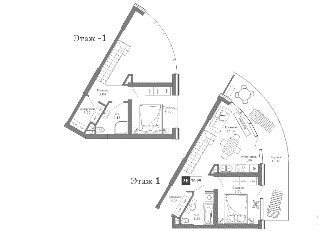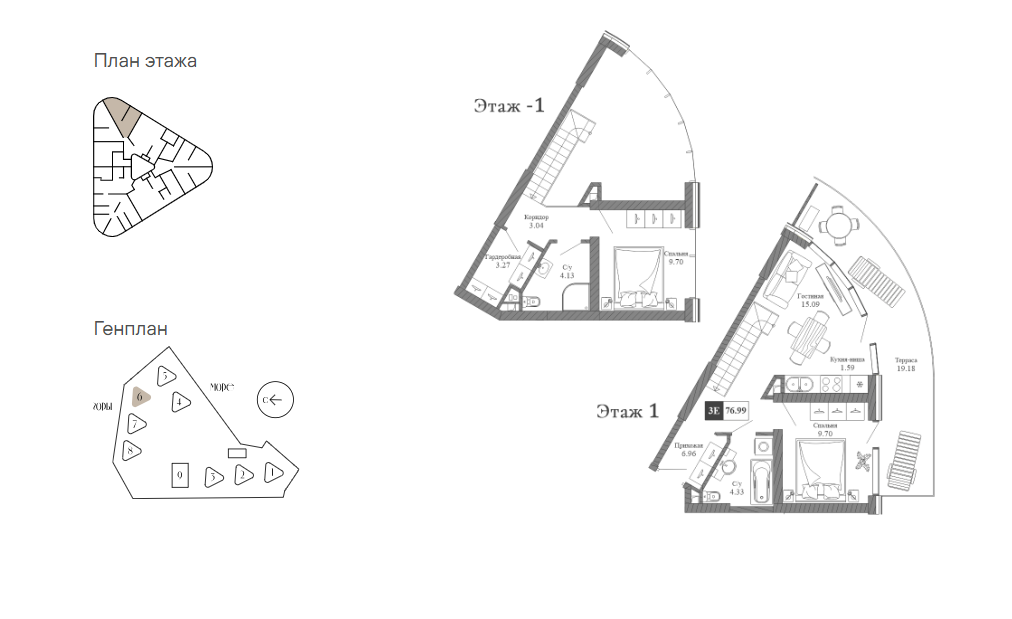 Двухуровневые апартаменты расположены на 1 этаже 20-этажного здания. Общая площадь — 76,99 кв.м., кухня-гостиная 16,68 кв.м., две спальни, два санузла., большая терраса с видом на море, в корпусе «Набоков» (введен в эксплуатацию в декабре 2025 г.).
