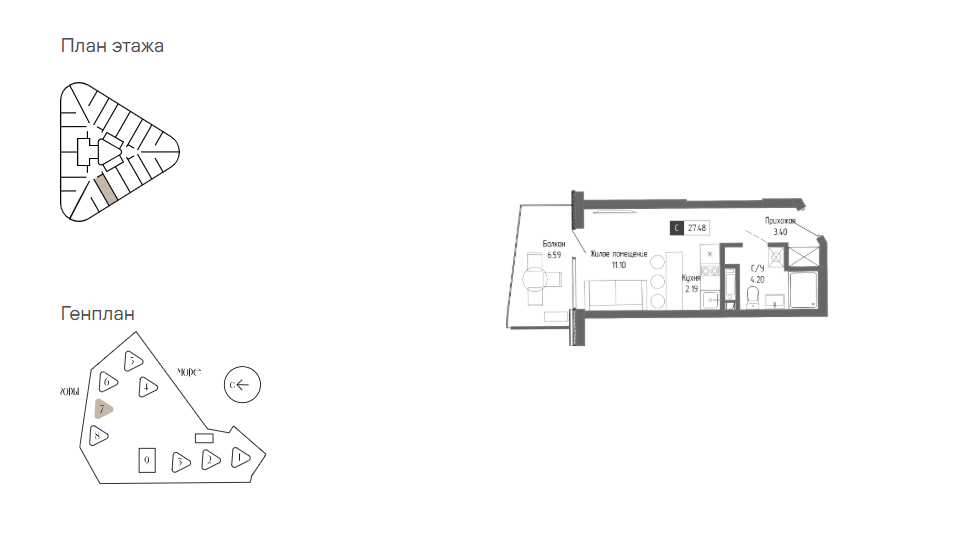 Апартаменты- студия площадью 27,48 кв.м., на 3м этаже 20-этажного здания, с видом на променад, в корпусе «Бунин» (ввод в эксплуатацию IV квартал 2026г.). Вид с балкона на внутренний двор и горы.