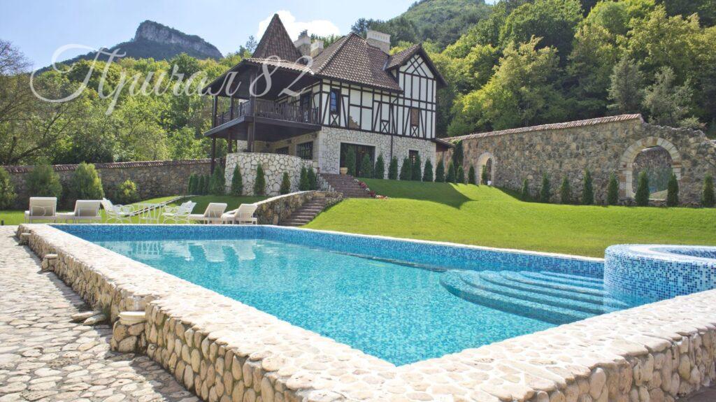 При строительстве и отделке использованы только природные материалы: камень, дерево, керамика. Благодаря чему поместье органично вписалось в первозданную природу.