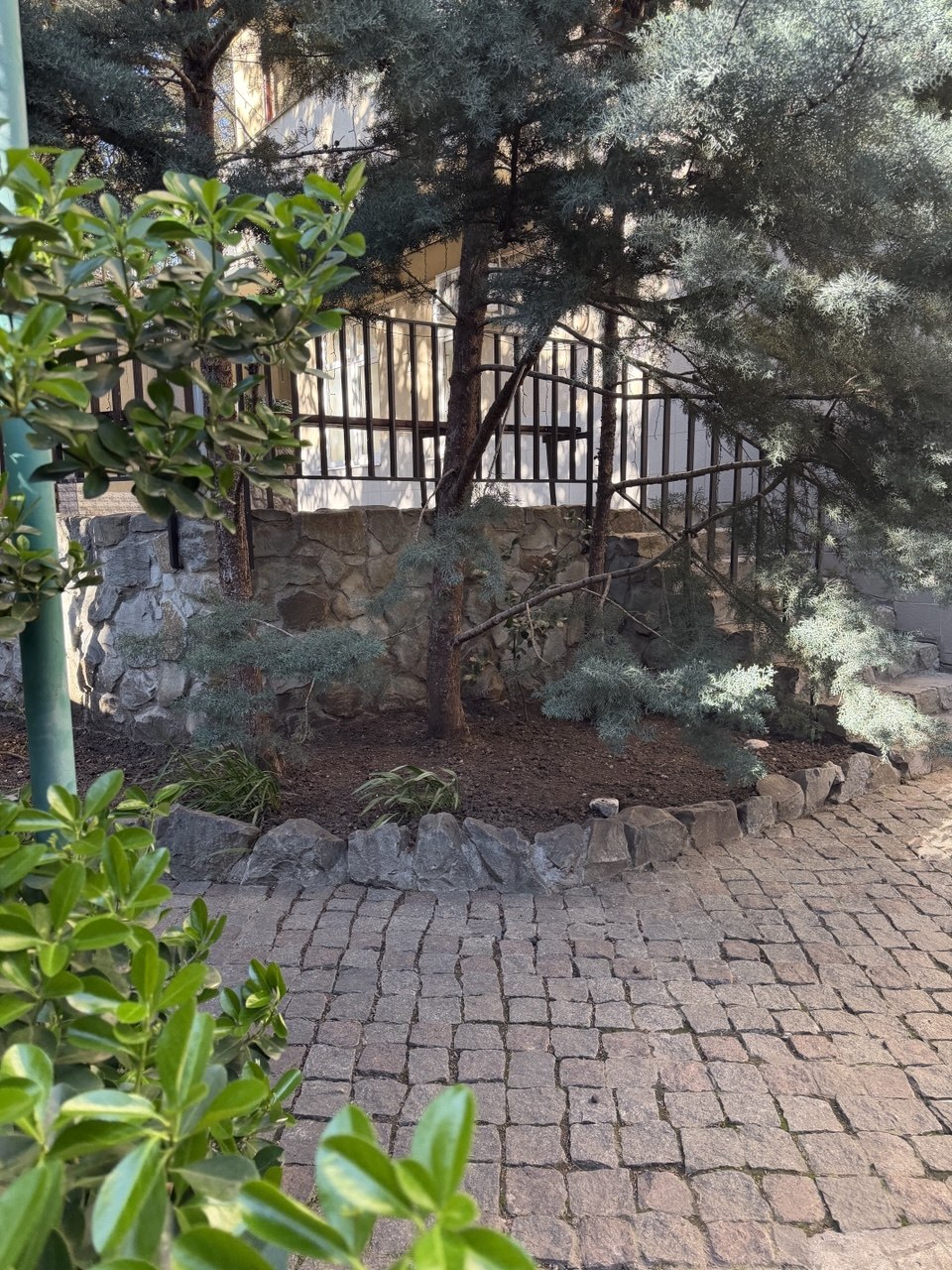 Двор в комплексе очень уютный, озеленён многолетними елями, кипарисами и вечнозелёными растениями, которые создают приятную атмосферу уюта и свежести круглый год. Также во дворе имеется зона для барбекю, что не мало важно для приятного времяпровождения в хорошей компании. К дому имеется заезд машиной, удобная транспортная развязка по городу, комфортный выезд на трассу без пробок.