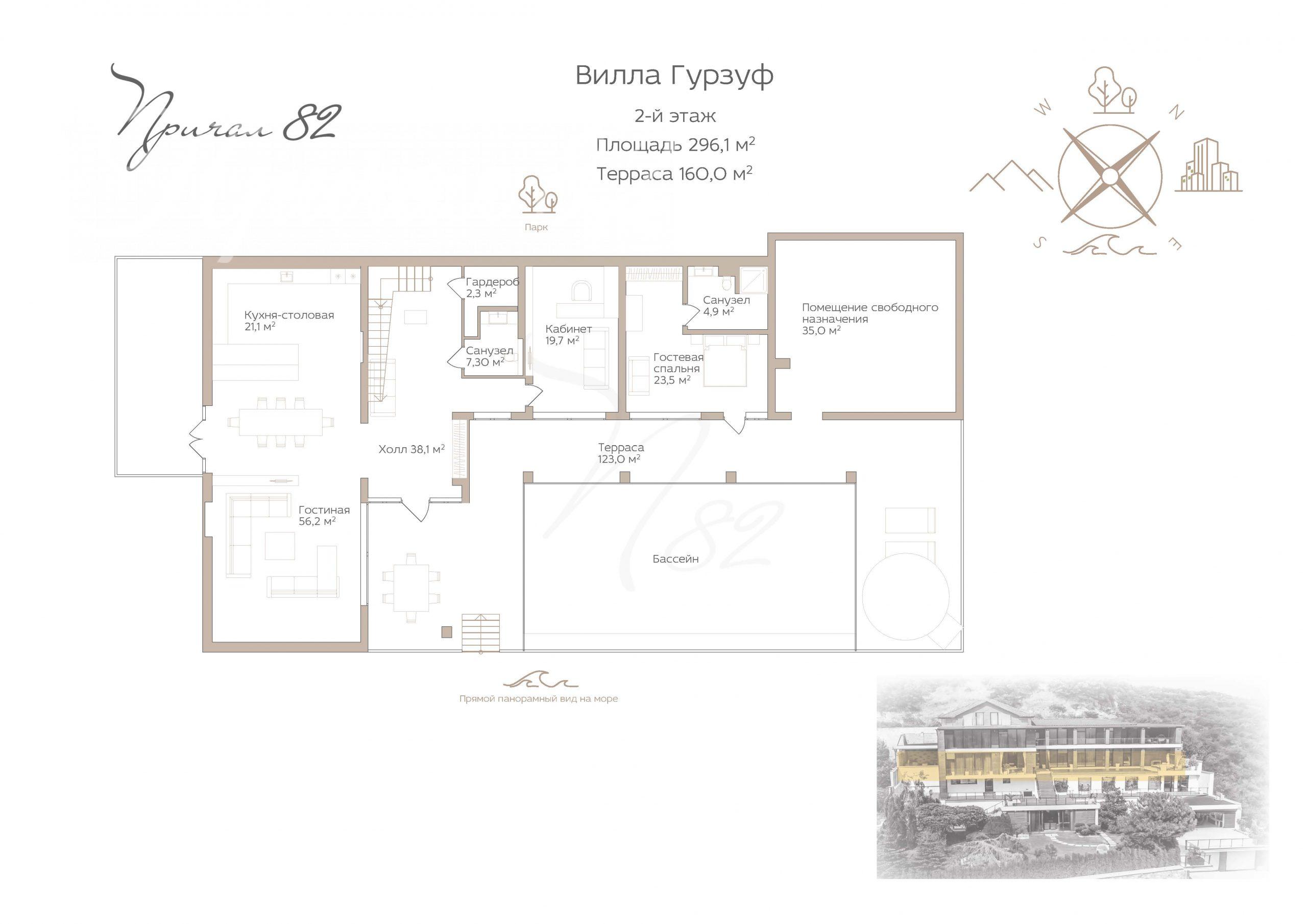 Первый этаж: инфинити бассейн, прихожая, кухня с залом, видовая терраса с выходном из зала, кабинет, с/у, спальня с отдельным входом и с/у, комната свободного назначения (предназначалась для спа комплекса или бильярдной, сегодня она под отделку и можно сделать под свои нужды)