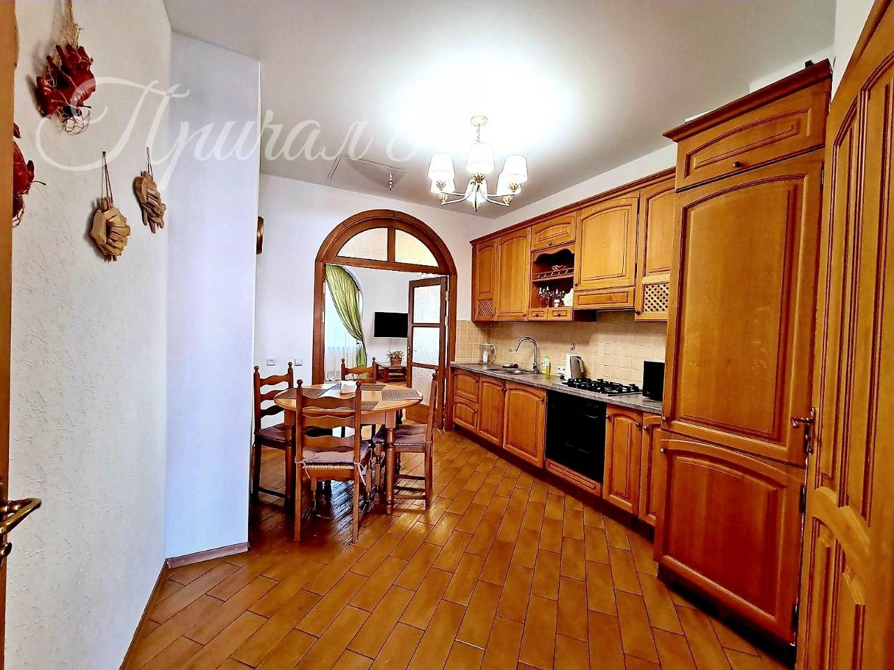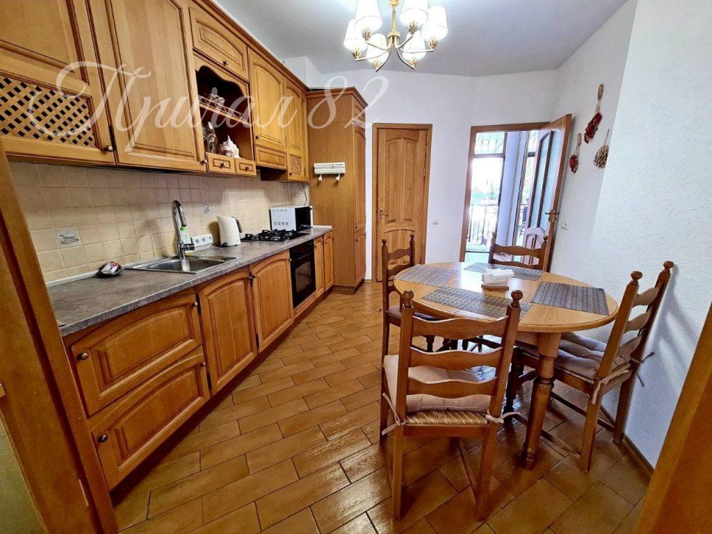Кухня со встроенным гарнитуром, обеденным столом и всей необходимой техникой:
