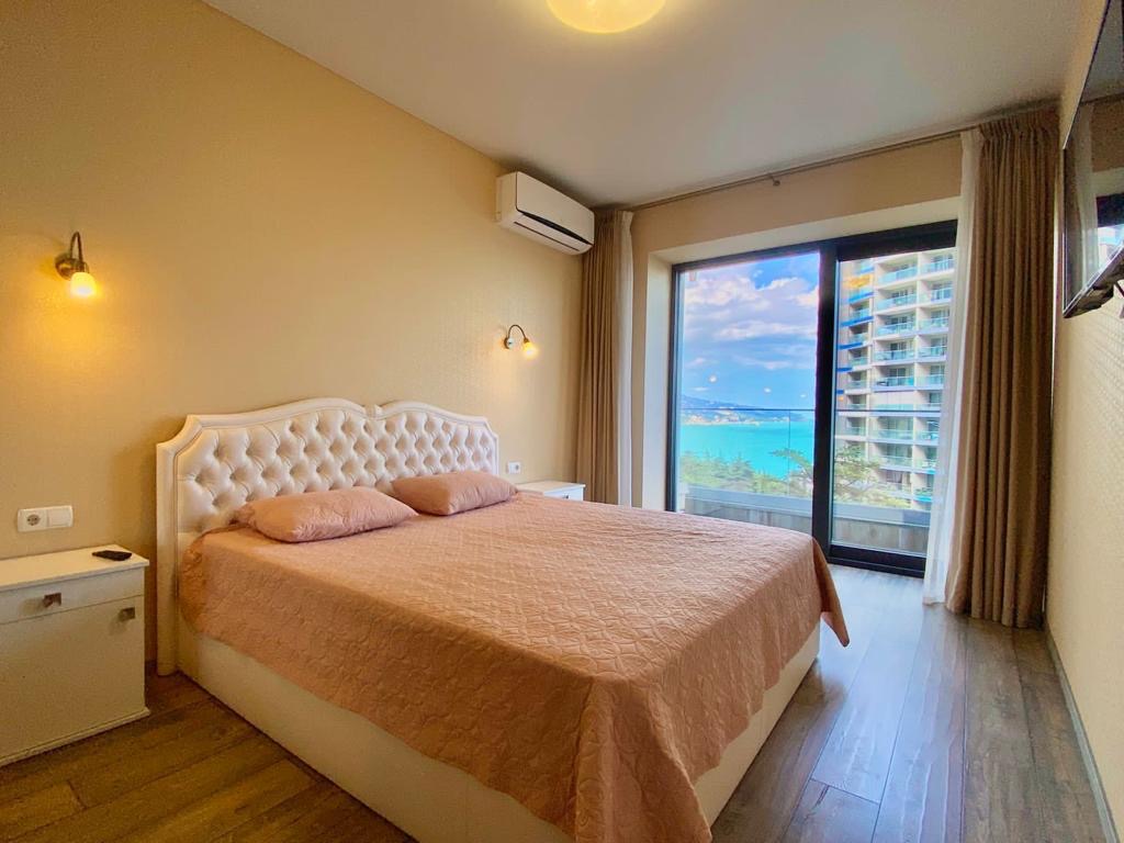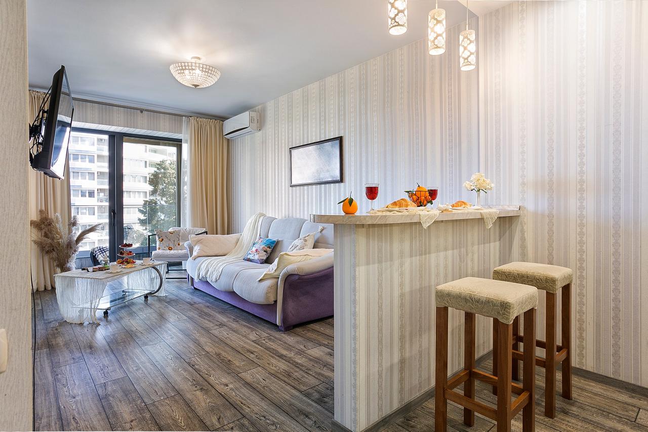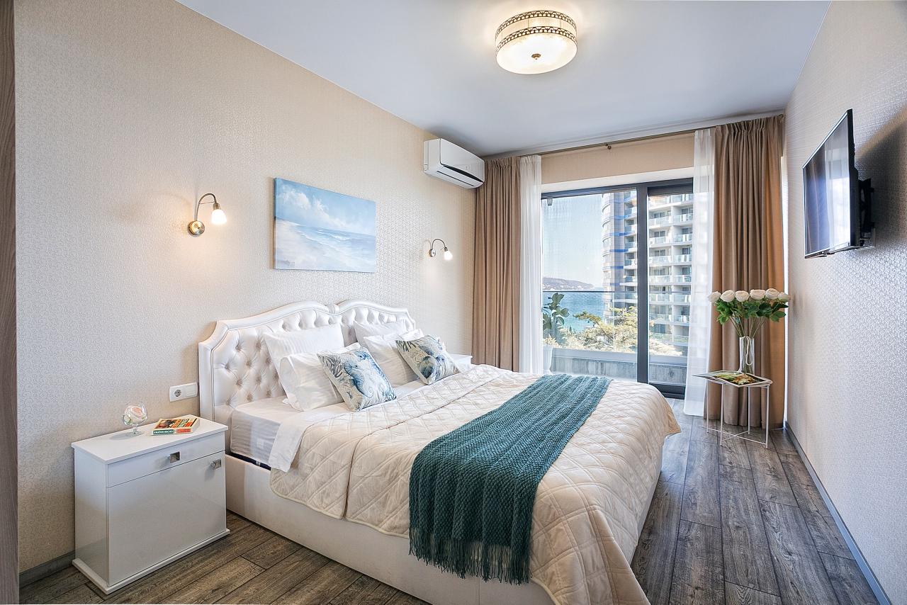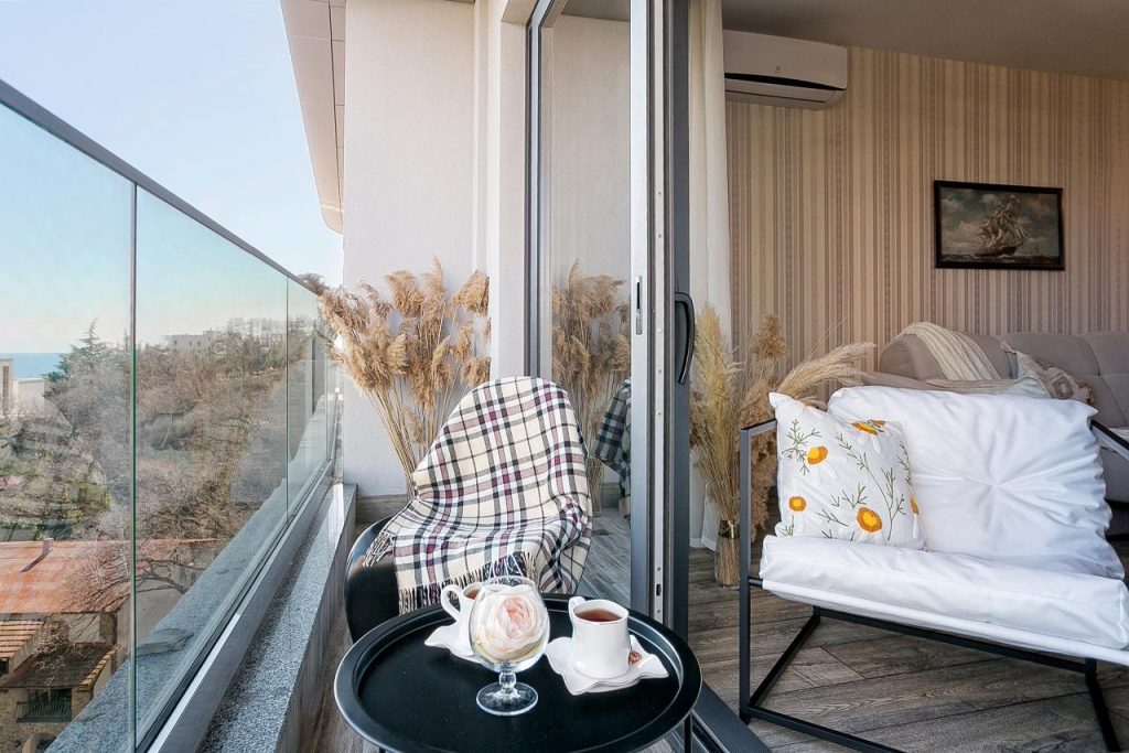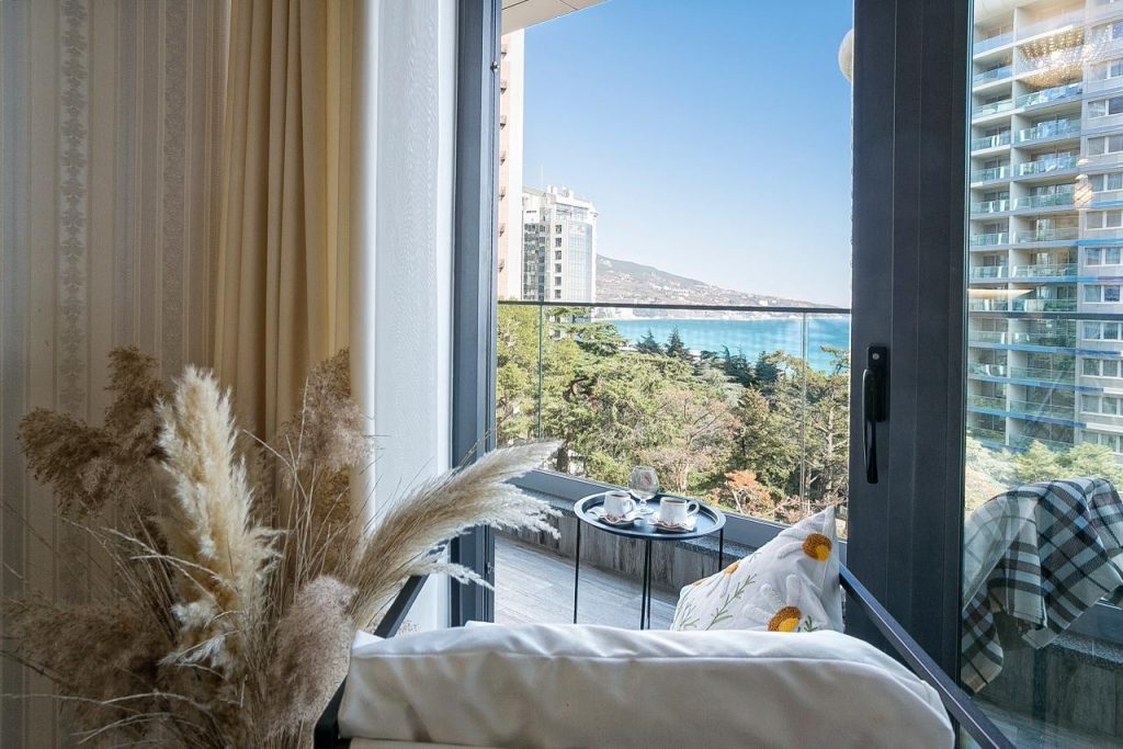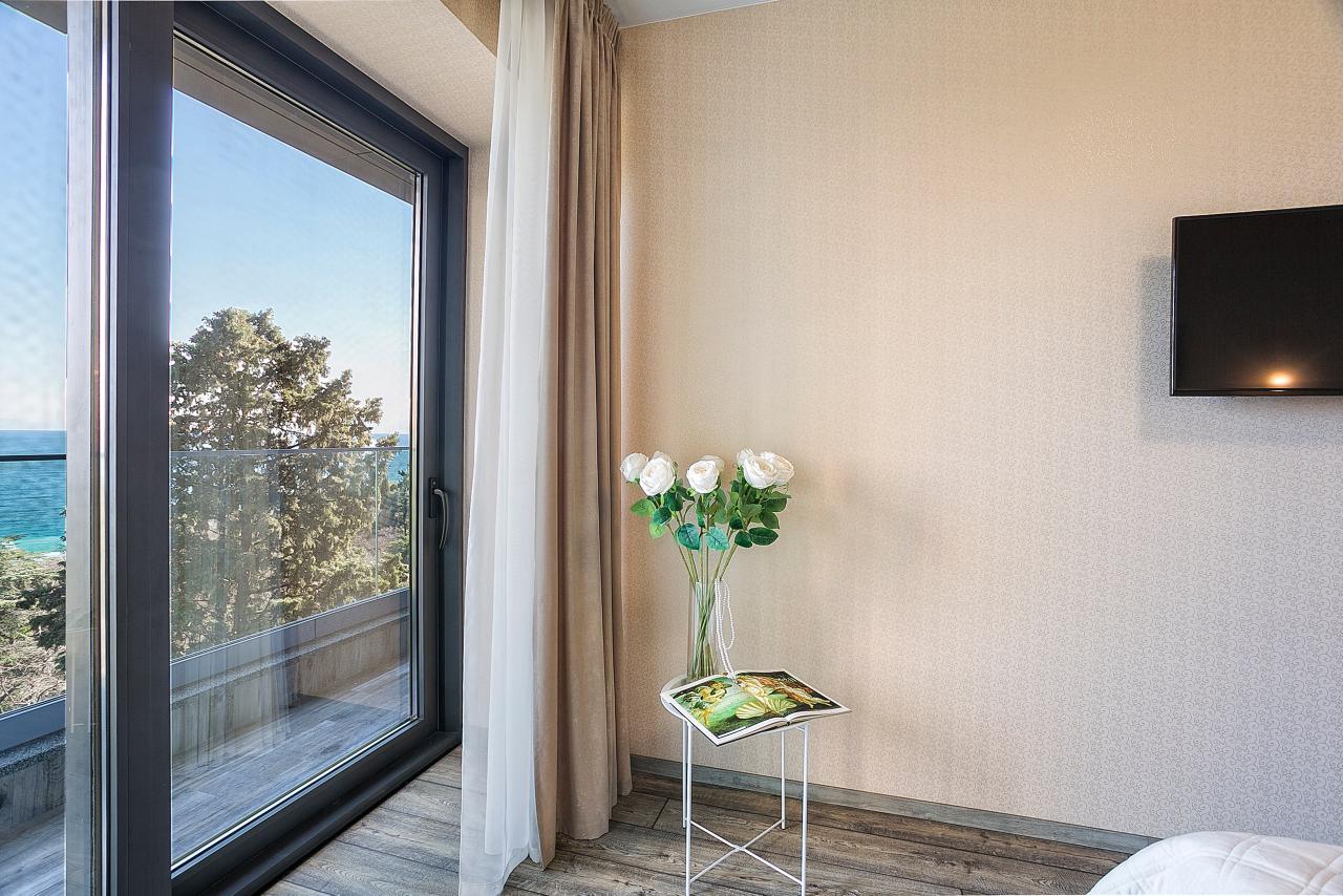 Из окон и с балкона квартиры открывается восхитительный вид на море и зелень Приморского парка.