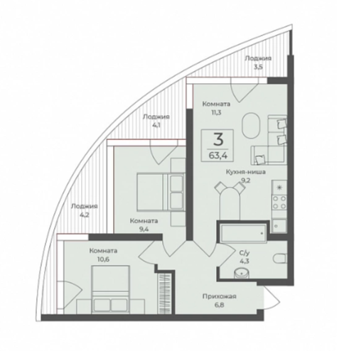 В апартаменте 3 лоджии — 3,5 кв.м., 4,1 кв.м. и 4,2 кв.м.