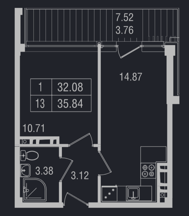 • общая площадь - 35,84 кв.м
