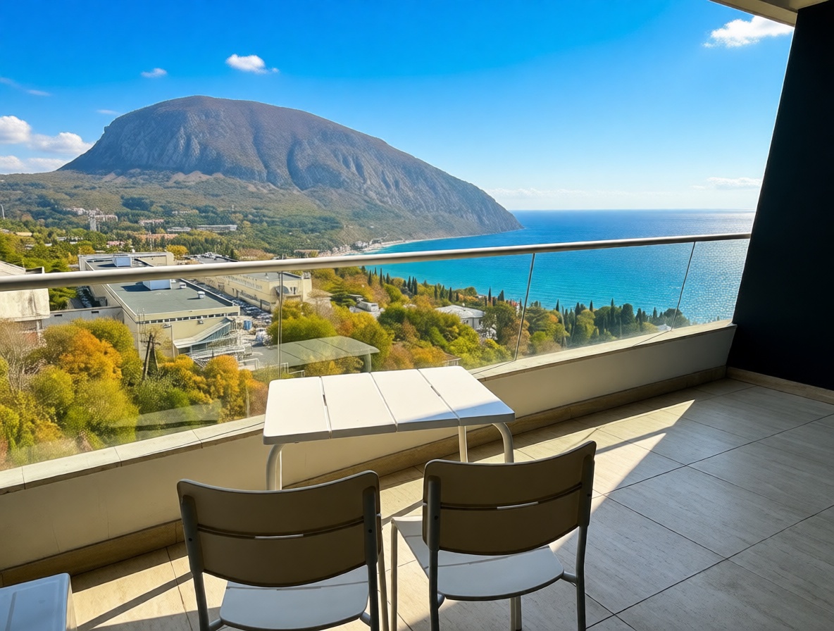 В апартаменте выполнена отделка «под ключ». Из окон открывается вид на море и гору Аю-Даг.