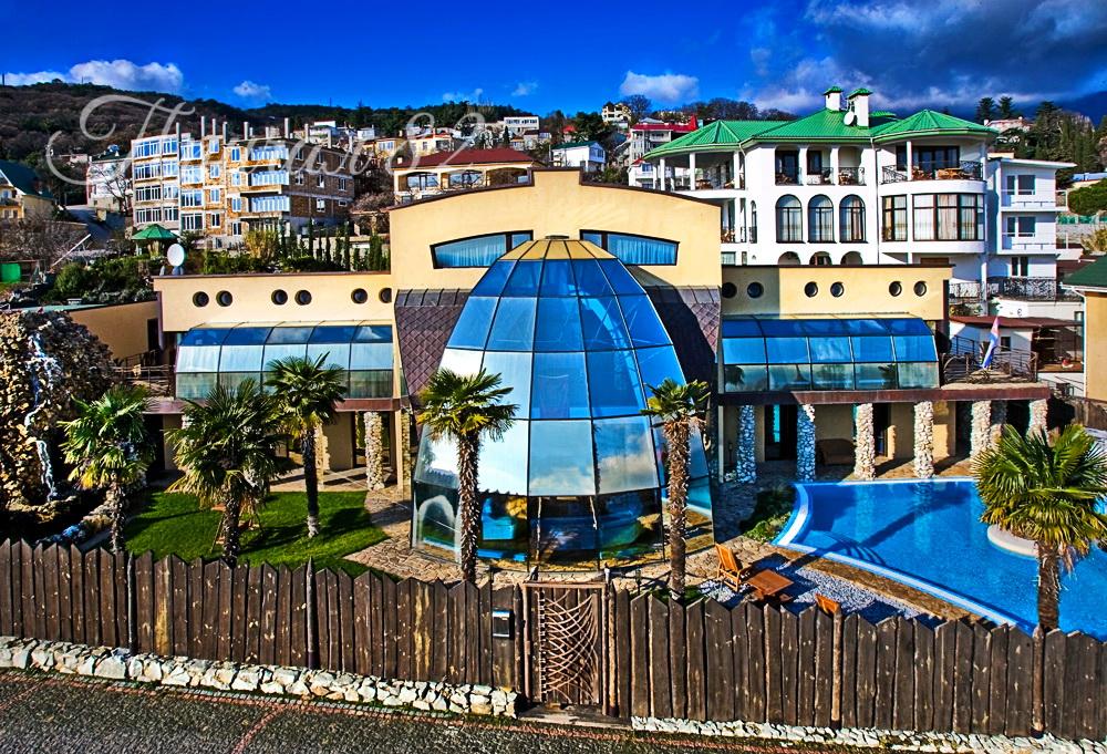 Просторная двусветная гостиная под стеклянным куполом, 6 спален (из них: 4 в основном доме и 2 гостевых номера), кинотеатр, кухня, тренажерный зал, сауна на дровах.