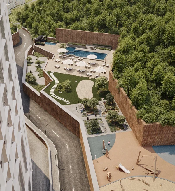 Приватная территория комплекса представляет собой ботанический сад с ресторанами и бассейном. Из всех окон квартир открываются захватывающие панорамы на морскую бухту, горные вершины и заповедный лесной массив.