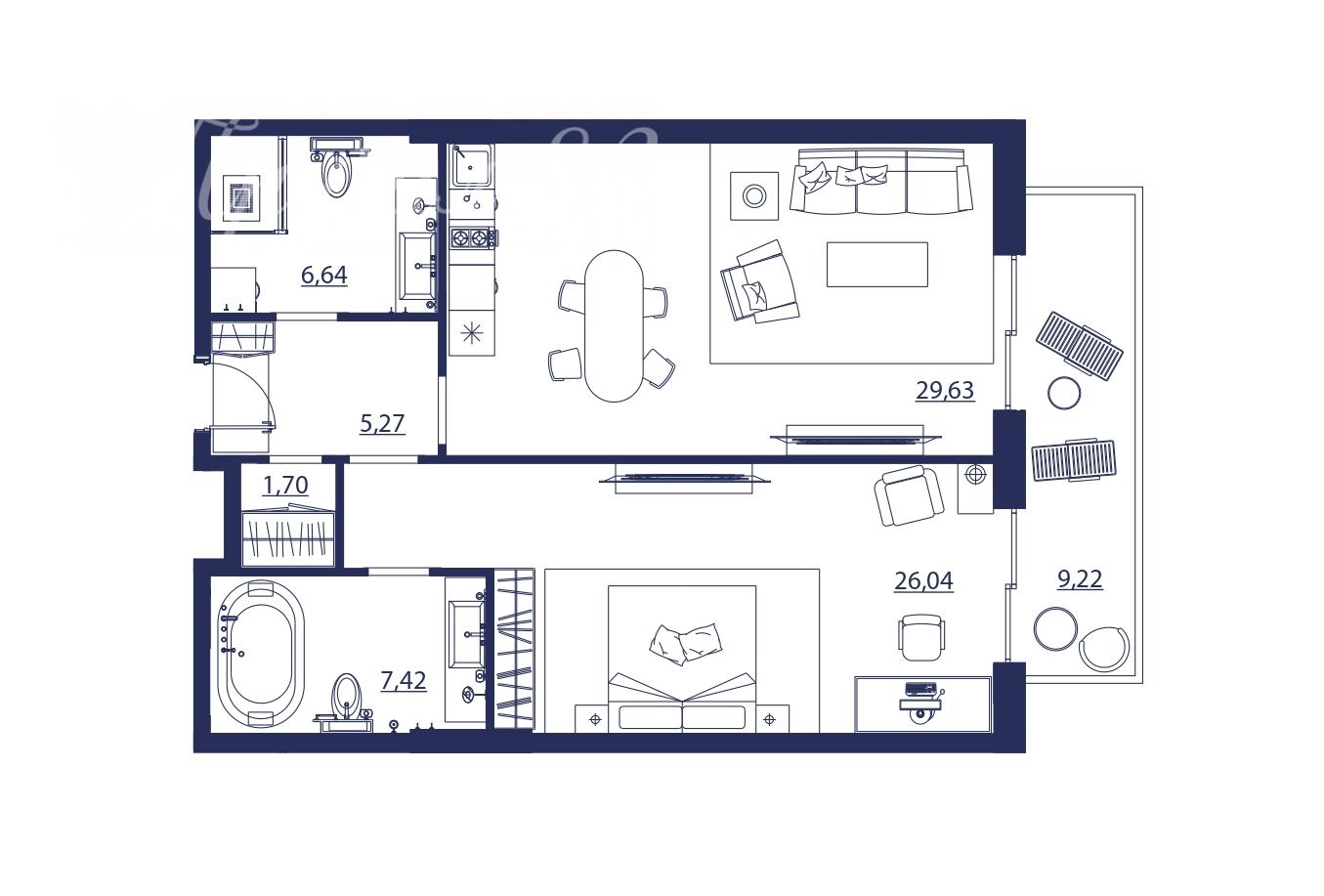 Двухкомнатные апартаменты 164 в апарт-комплексе Кедровый, общей площадью 85,92 кв.м, с видом на море и горы.