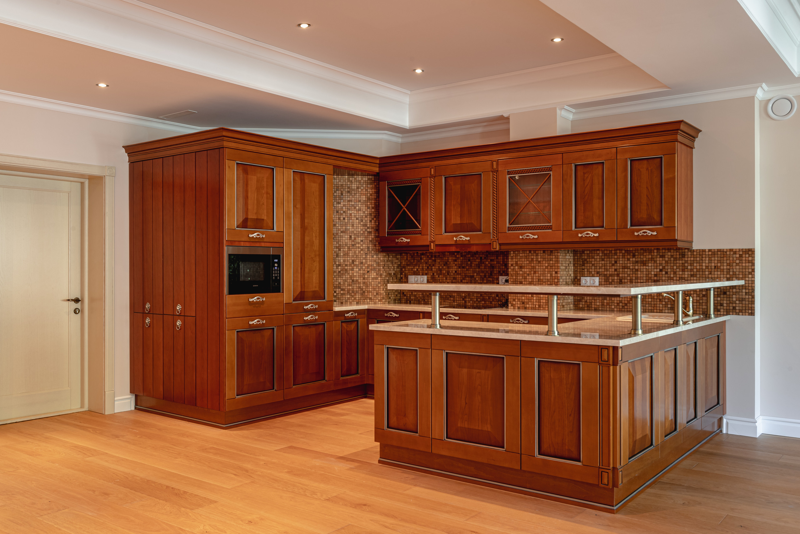 — кухня со встроенной техникой: холодильник, посудомоечная машина, микроволновая печь, стиральная машина, варочная поверхность Electrolux/Bosch, столешница из натурального мрамора.