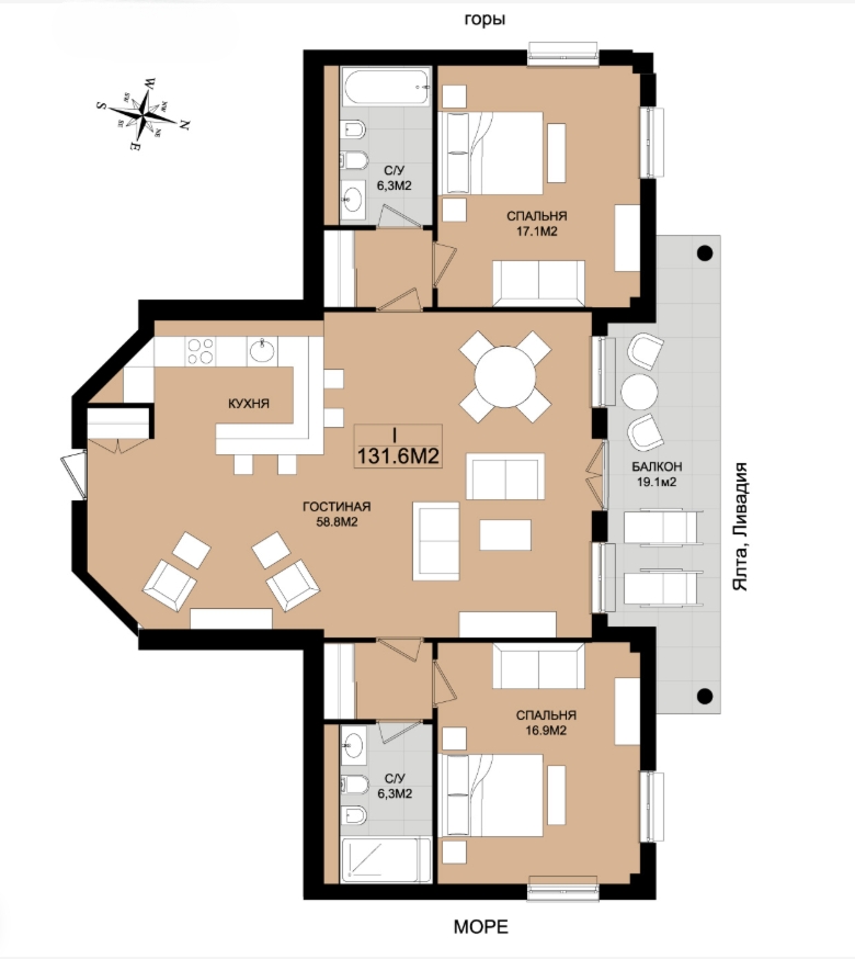 Апартамент включает 2 спальни с гардеробными и санузлами, просторную кухню-гостиную, а также террасу.