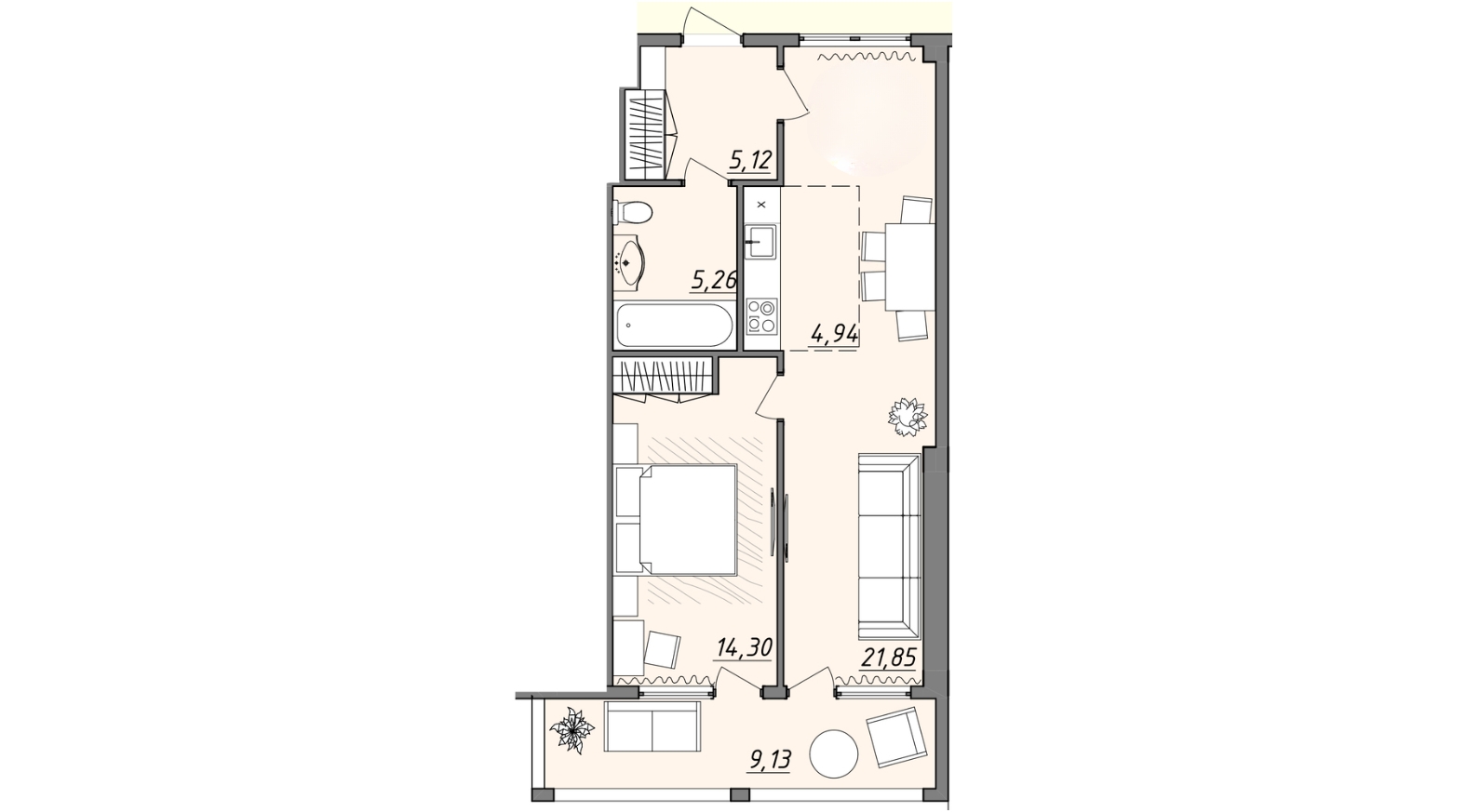 Квартира включает в себя — 1 спальню, кухню-гостиную, с/у, 1 балкон.