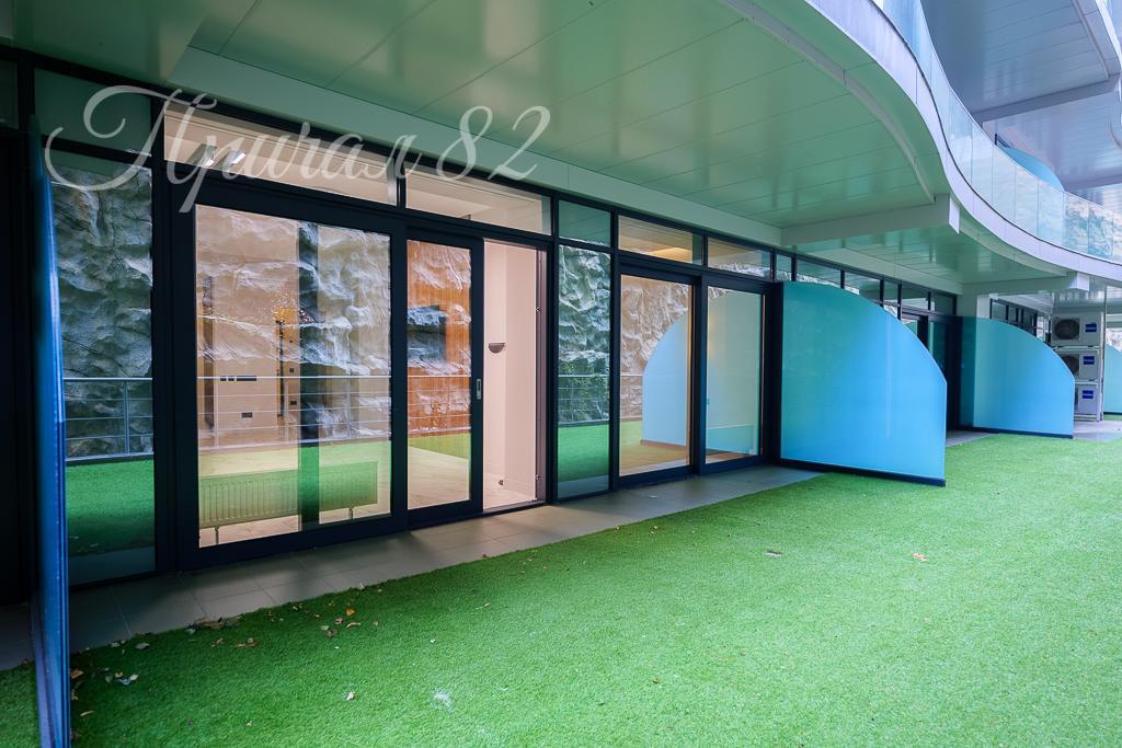 Фишка апартамента — большая открытая зеленая терраса, панорамное остекление и высокие потолки.