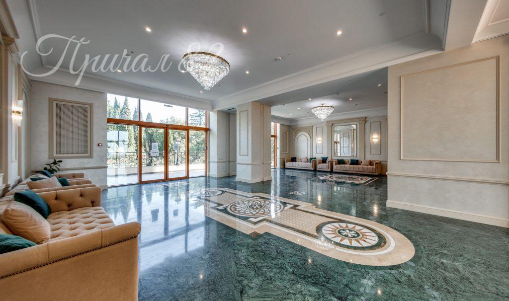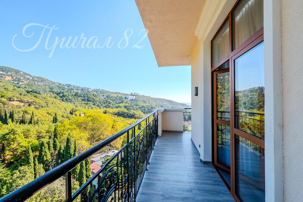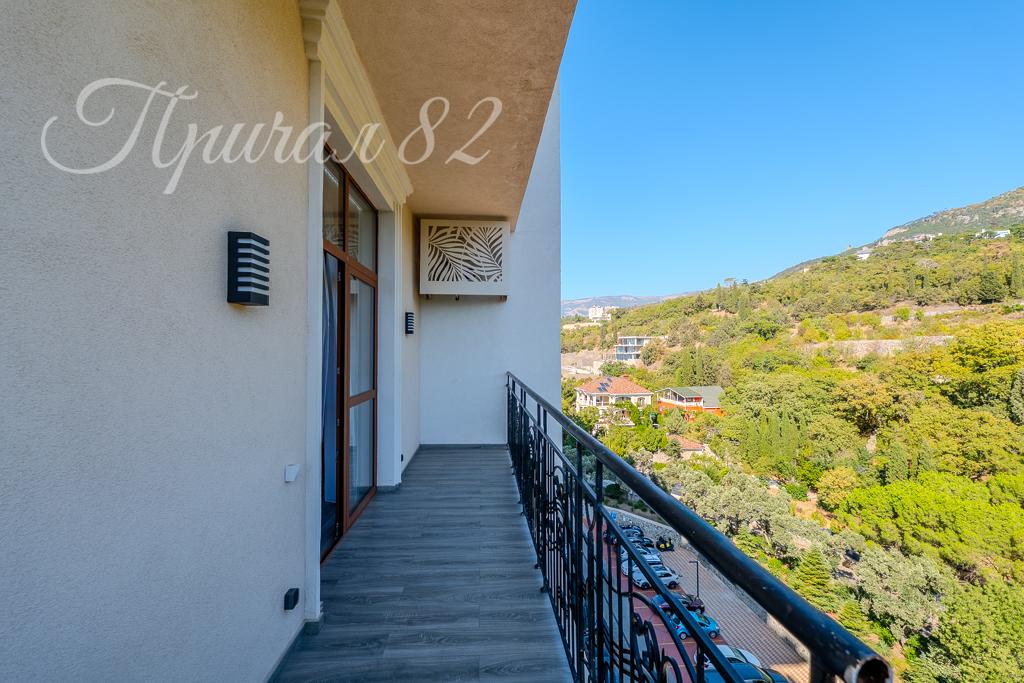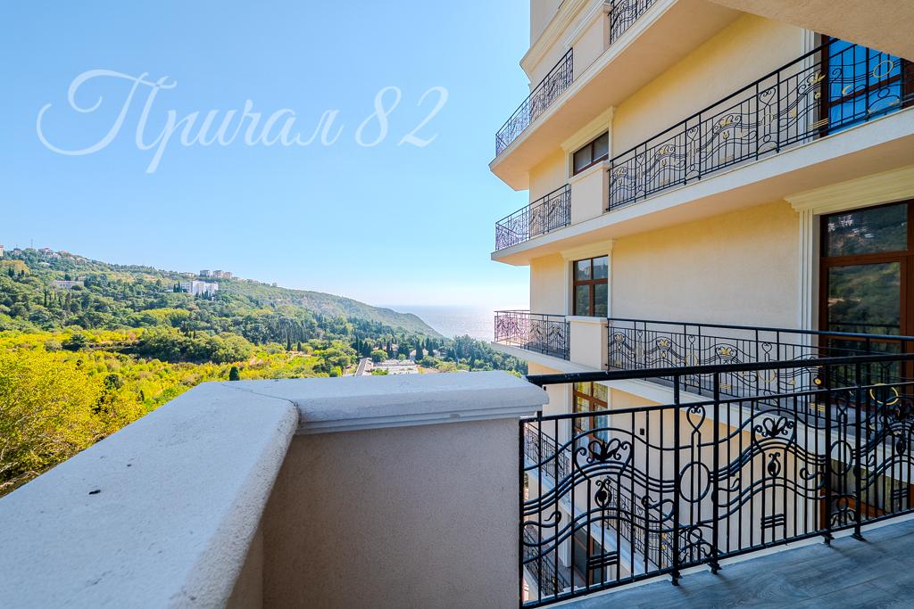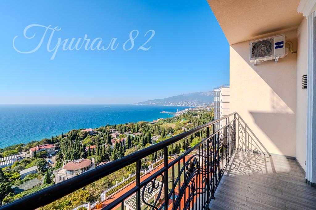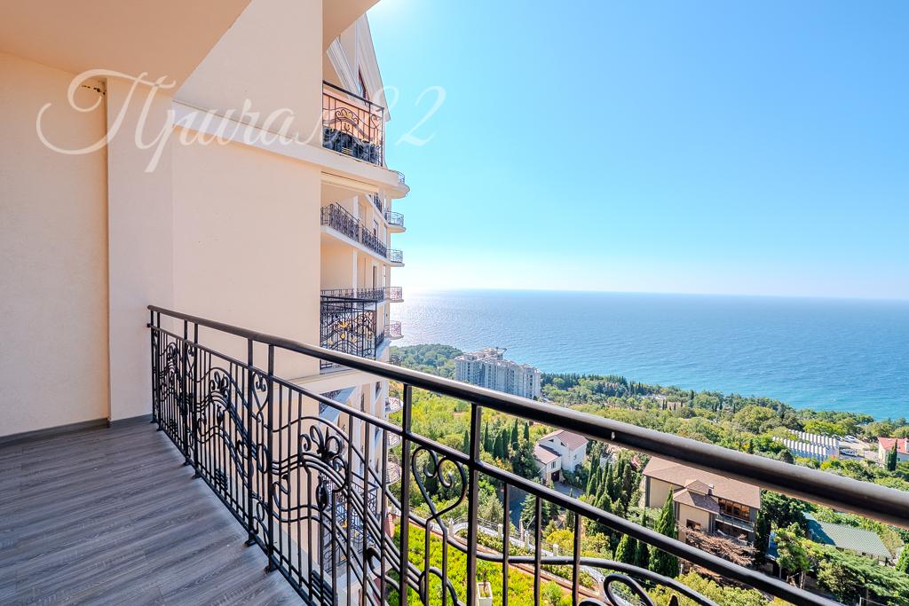 Квартира общей площадью 102,4 кв.м, расположена на 7 этаже 10 этажного корпуса. Главное достоинство –панорамное остекление. Окна выходят на 2 стороны света и с обеих сторон имеется свой большой видовой балкон. С Юга вид открывается на море, горный хребет и ялтинскую бухту, с Севера вид открывается на заповедную зону и Никитский ботанический сад. Высокие потолки – 3,40 м – дарят много света и воздуха.