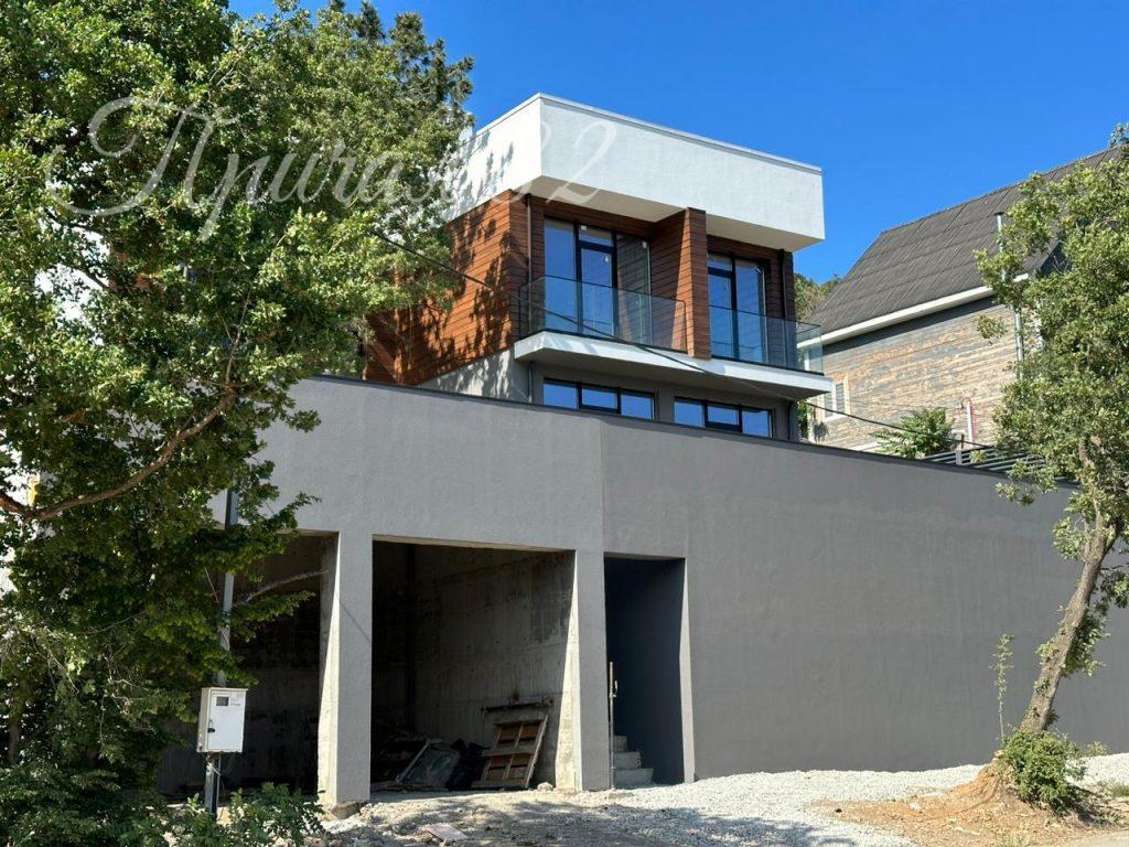 Дом утеплен, фасад частично отделан планкеном, окрашен. Установлены панорамные алюминиевые окна, стеклянное ограждение балконов, забор по периметру участка, подведены коммуникации.