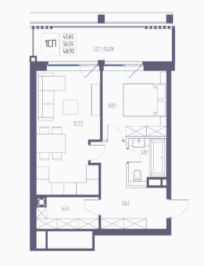 Общая площадь — 56,52 кв.м. Балкон — 10,89 кв.м.