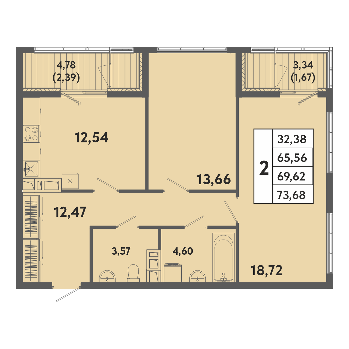 Общая площадь — 73,68 кв.м. Расположена на 2-м этаже.