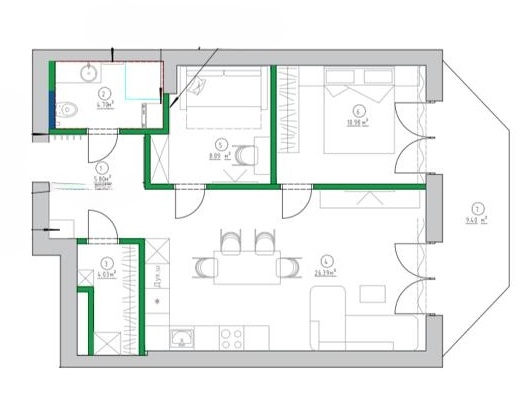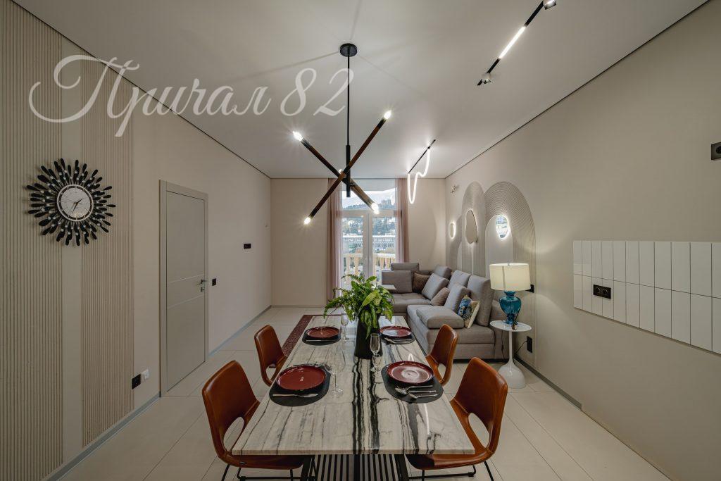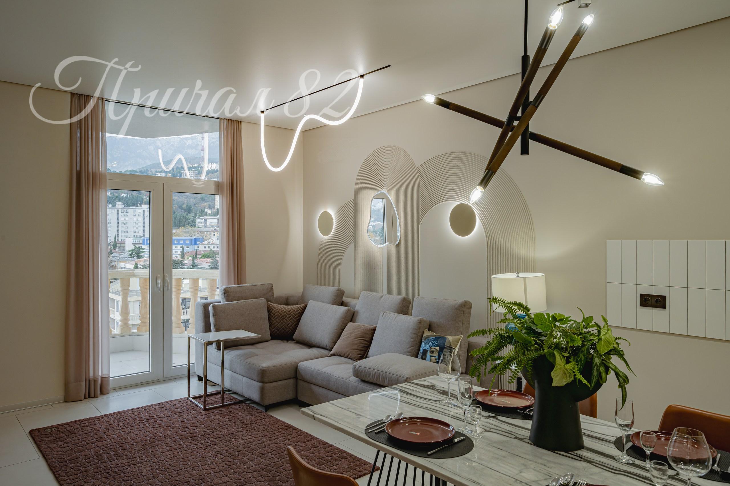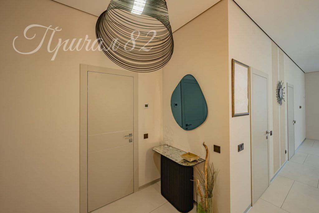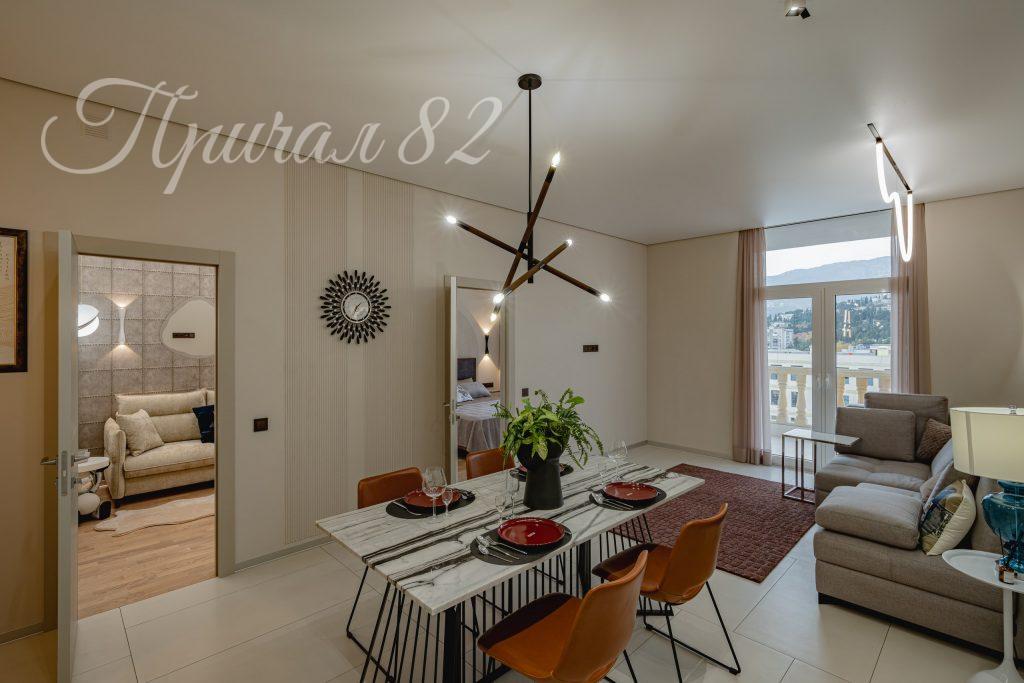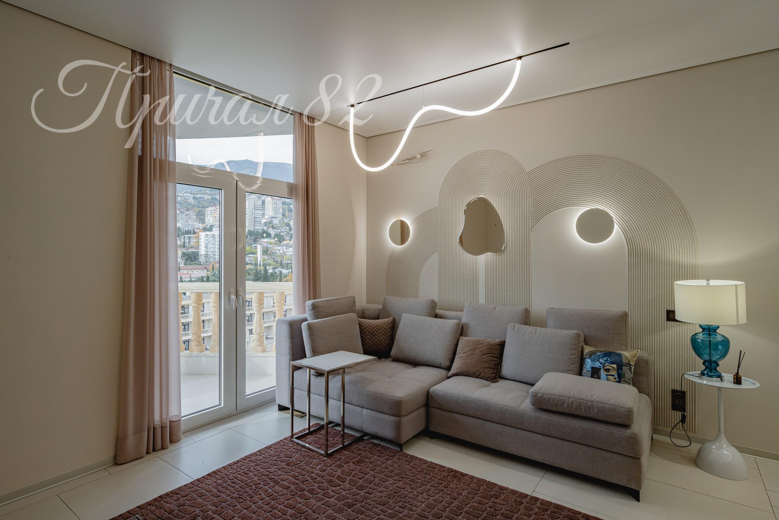 Квартира включает в себя — 2 изолированные спальни, кухню-гостиную, прихожую, гардероб, санузел и видовую террасу.
