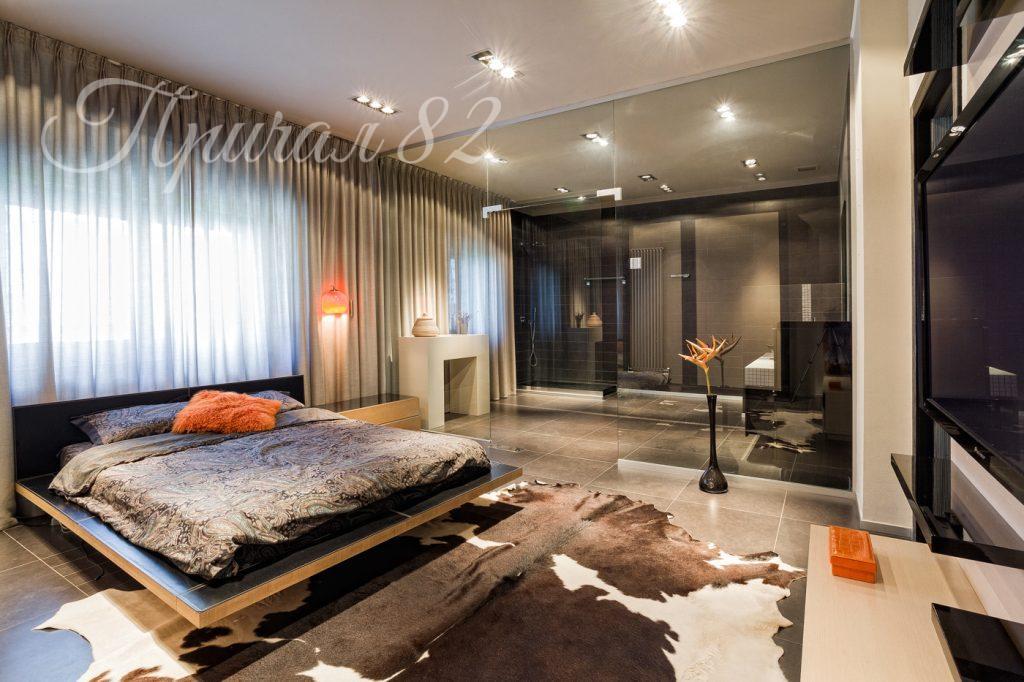 спальня с двуспальной кроватью, плазменным телевизором, санузлом с душевой и гардеробной.