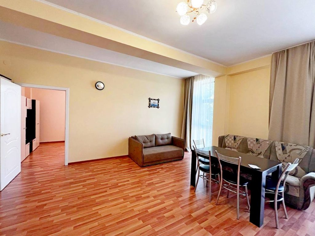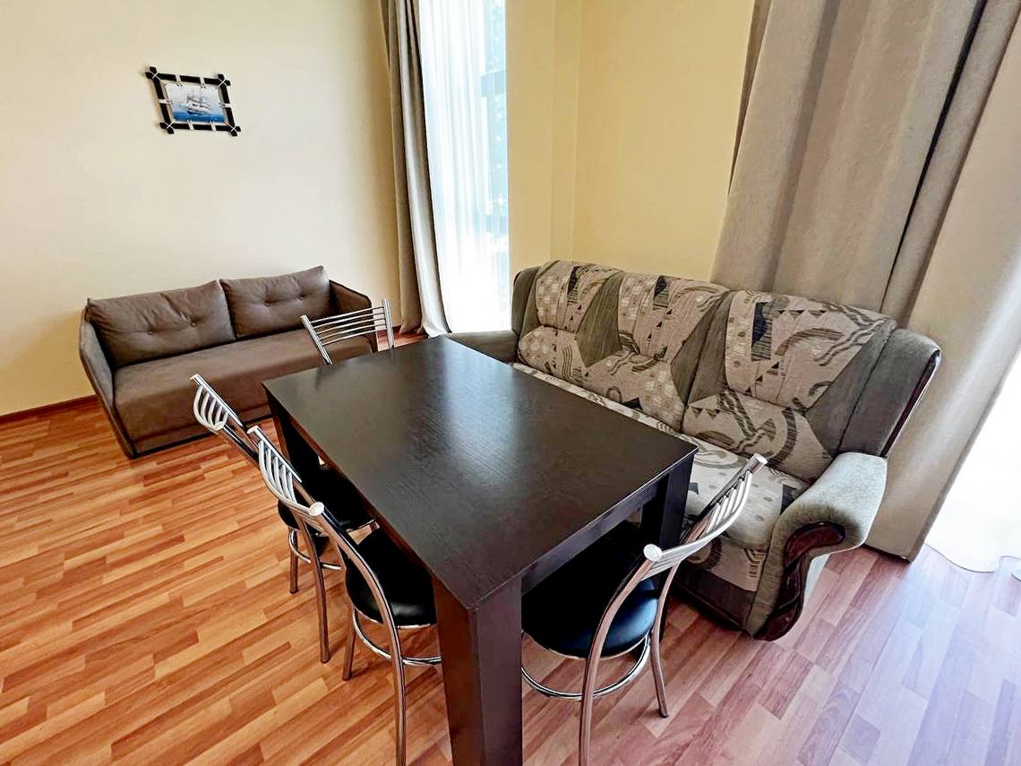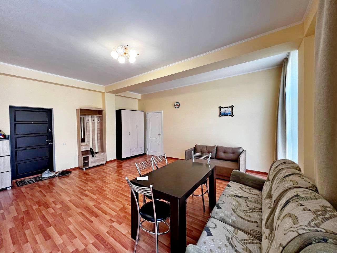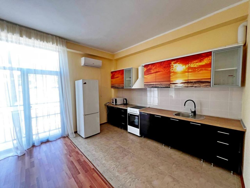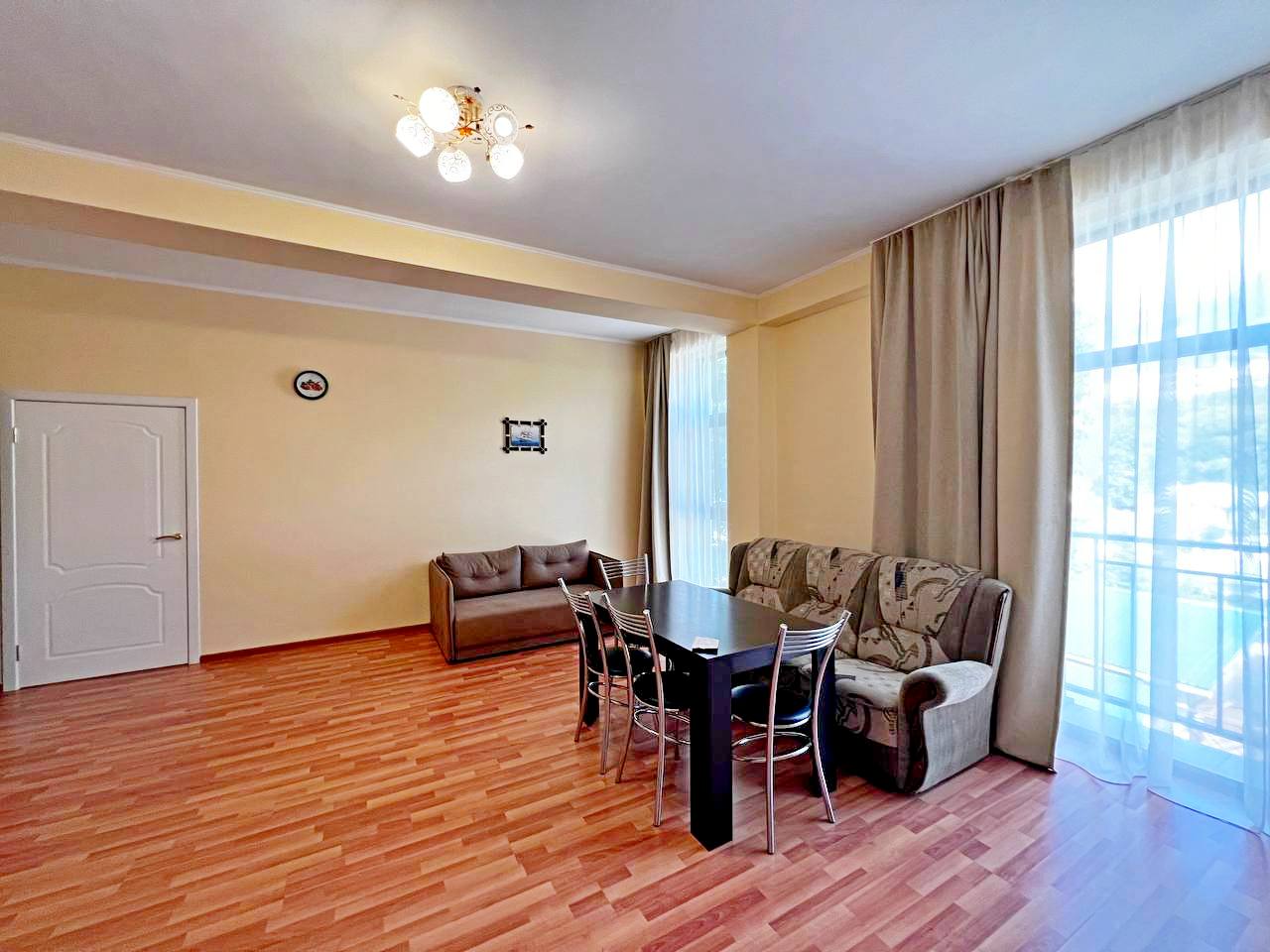Просторная гостиная-кухня с обеденным столом и встроенным кухонным гарнитуром, выходом на небольшой балкон с хорошим видом на горы;
