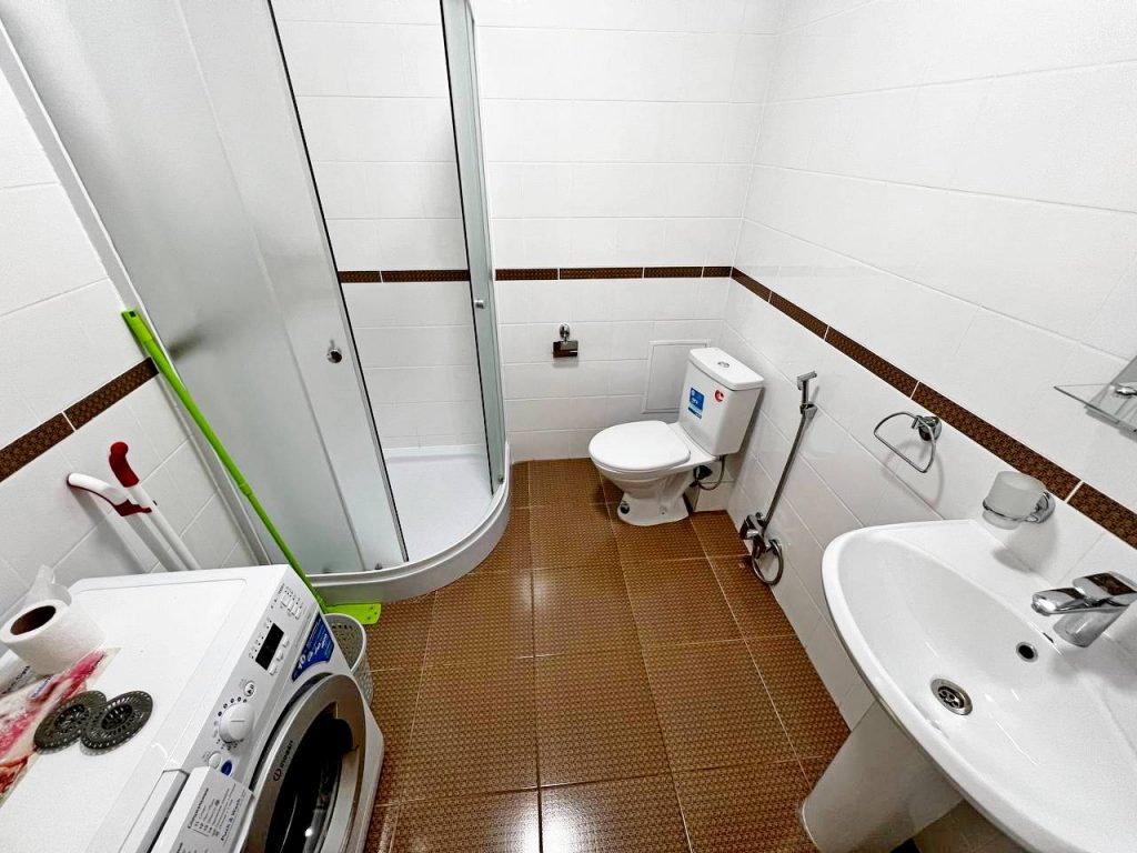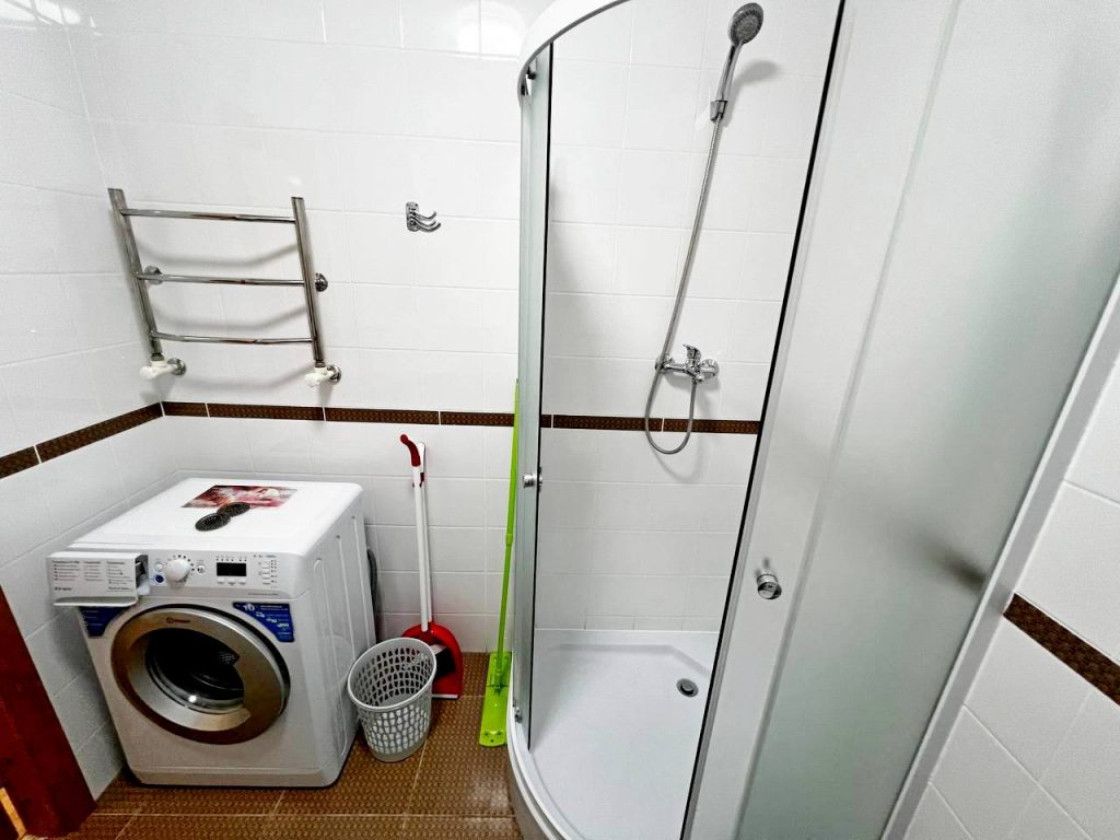 санузел с душевой, биде и стиральной машиной.