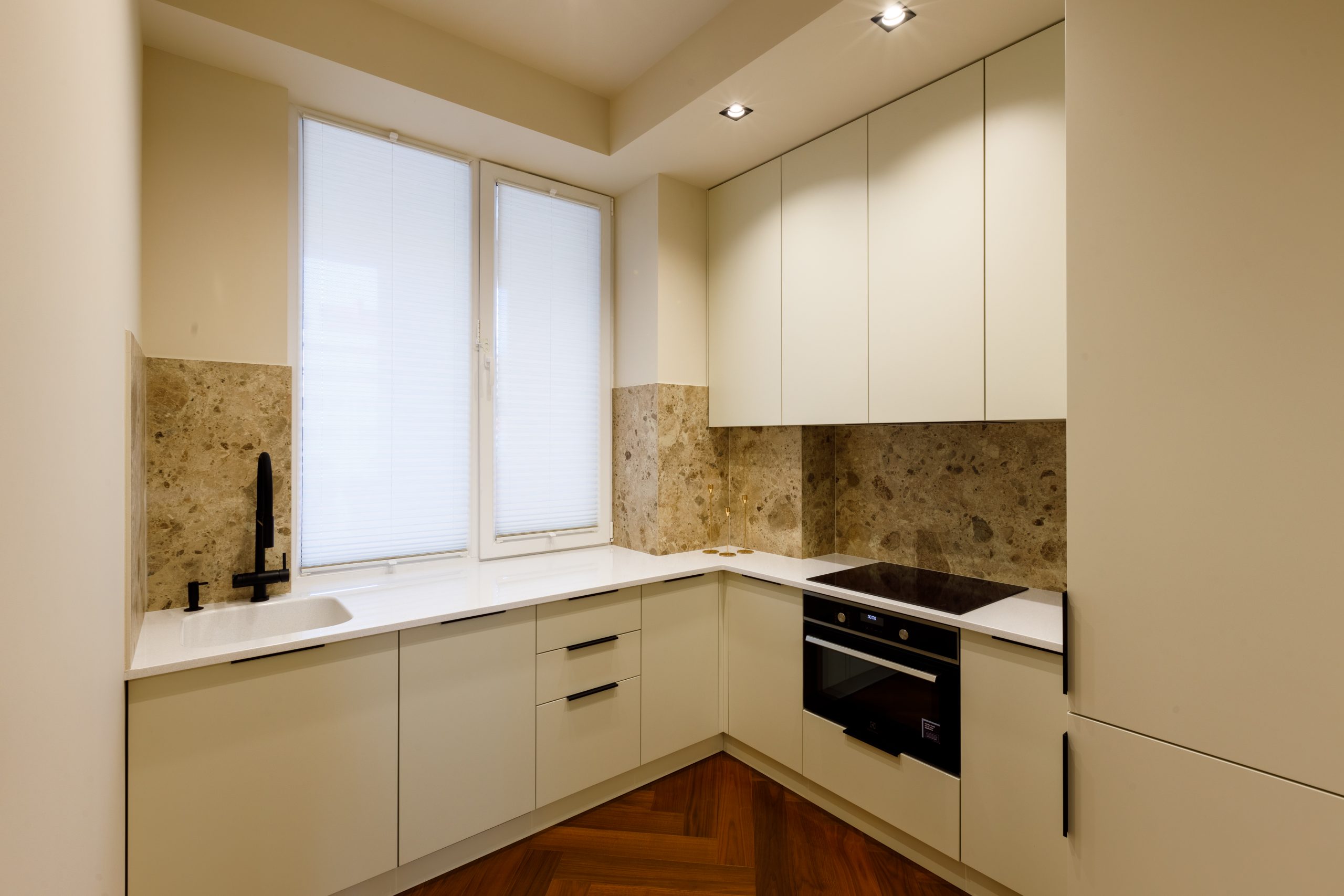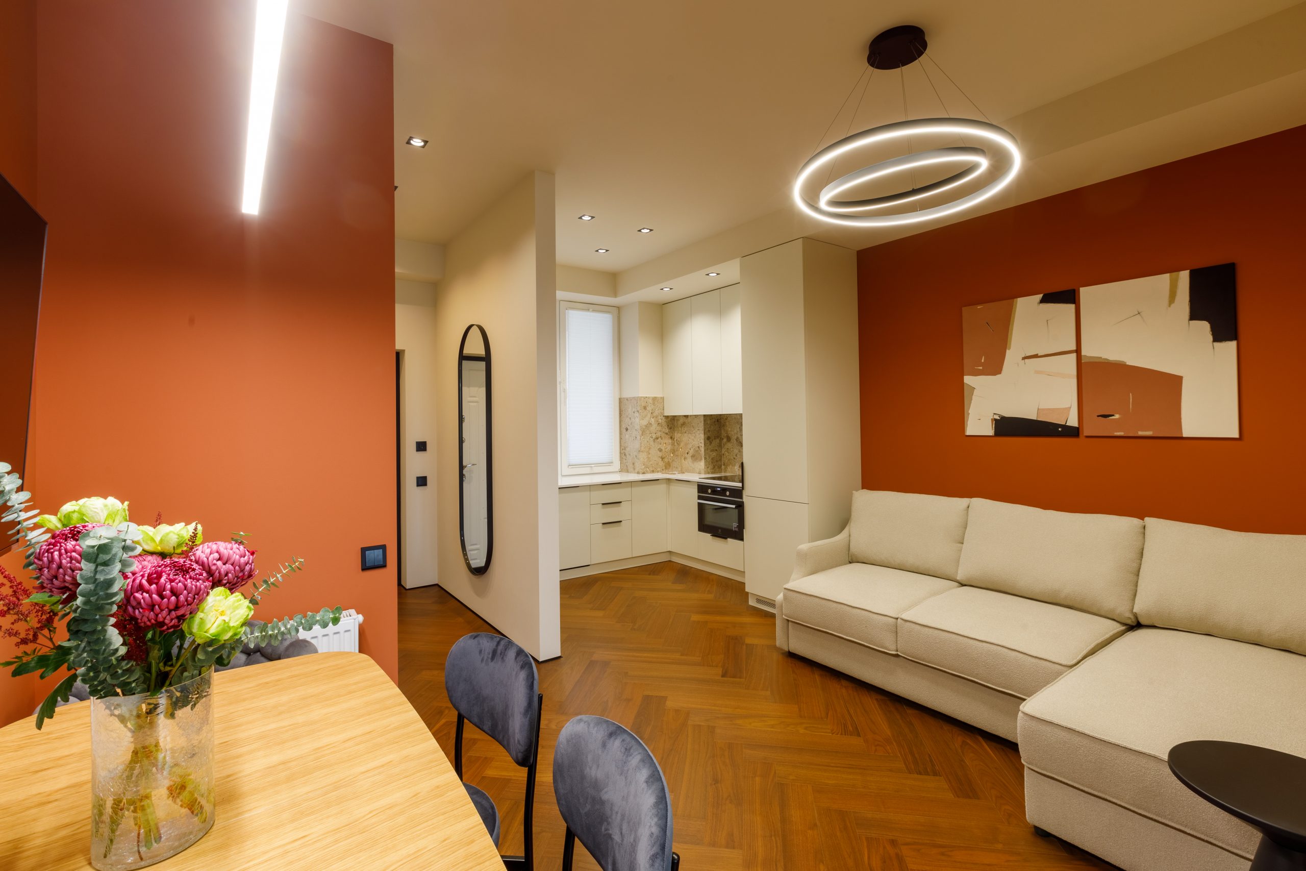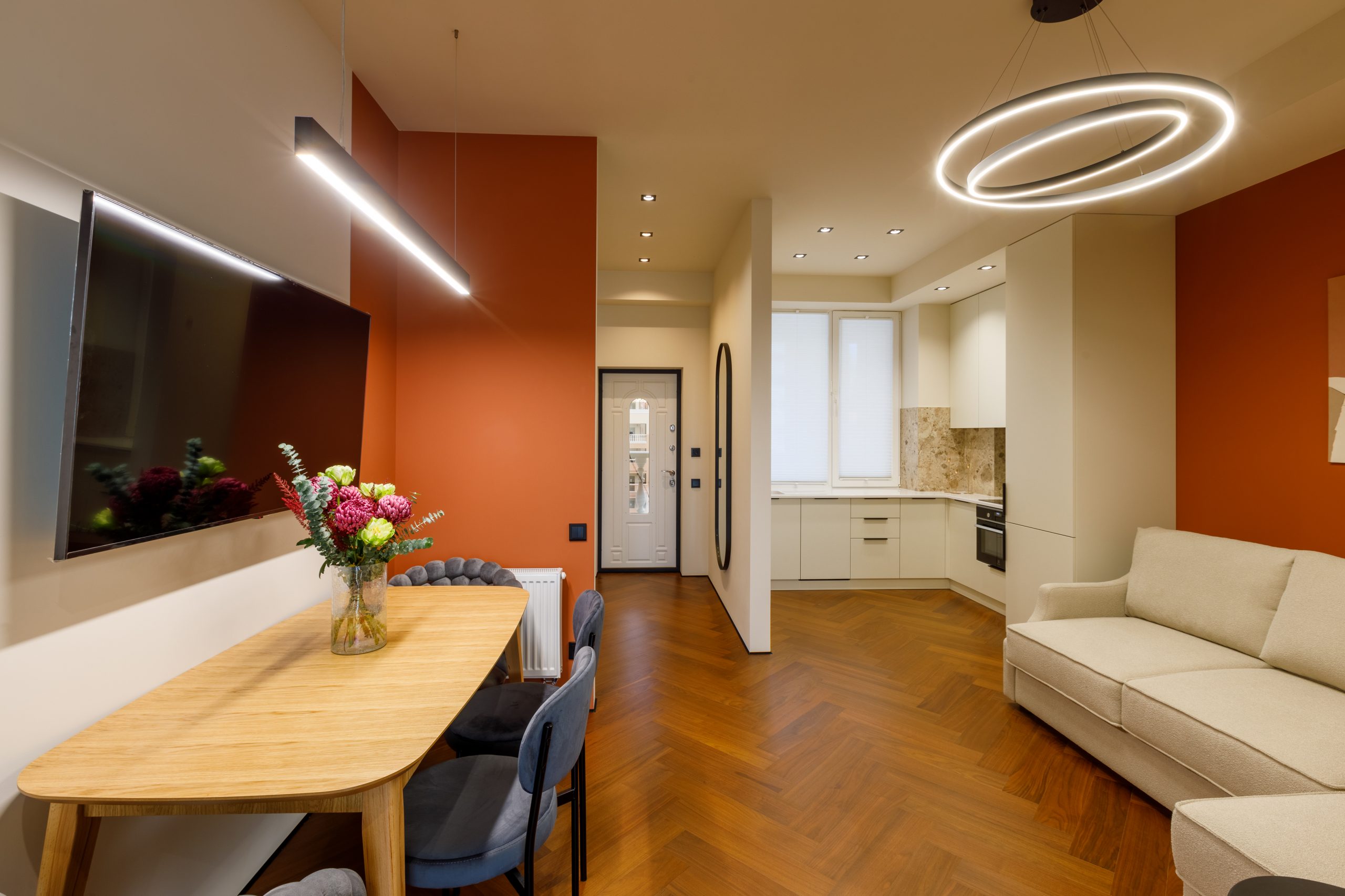 Напольные покрытия из кварц-паркета Орех и крупноформатная керамическая плитка Italon добавляют интерьеру изысканности. Стены, окрашенные моющейся бархатисто-матовой краской Eskaro, создают уютную атмосферу. Отопление обеспечивается надежным электрическим котлом Ferroli, а боковой вид на море, открывающийся из окон, подарит вам незабываемые морские пейзажи.