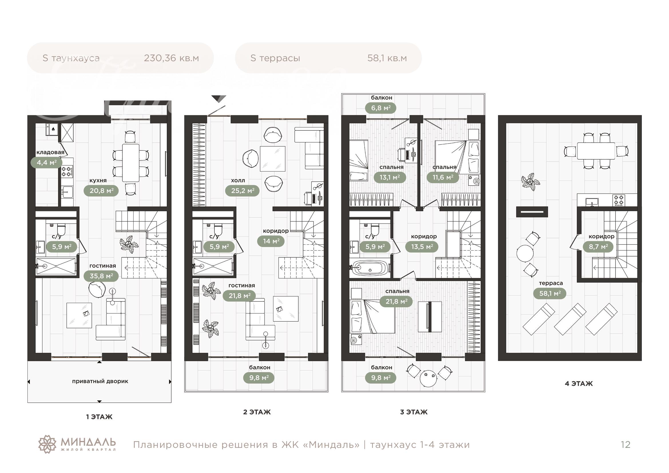 Таунхаусы оборудованы террасами и зонами барбекю.
